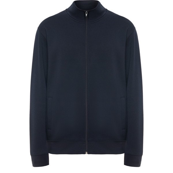 High collar sweat jacket with matching zip. Matching inner collar with reinforced covered seams. 1x1 ribbed fabric in cuffs and waist.