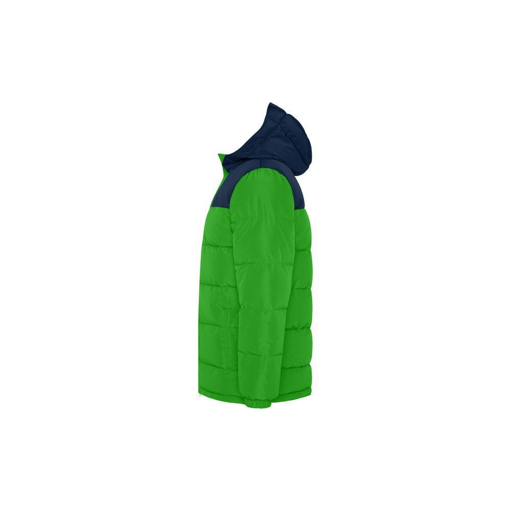 Padded jacket with fixed hood.Front zipper covered with a placket.Chin guard. Two side pockets with zip.Elastic cuffs. Internal access for reprocessing in the back and left chest.