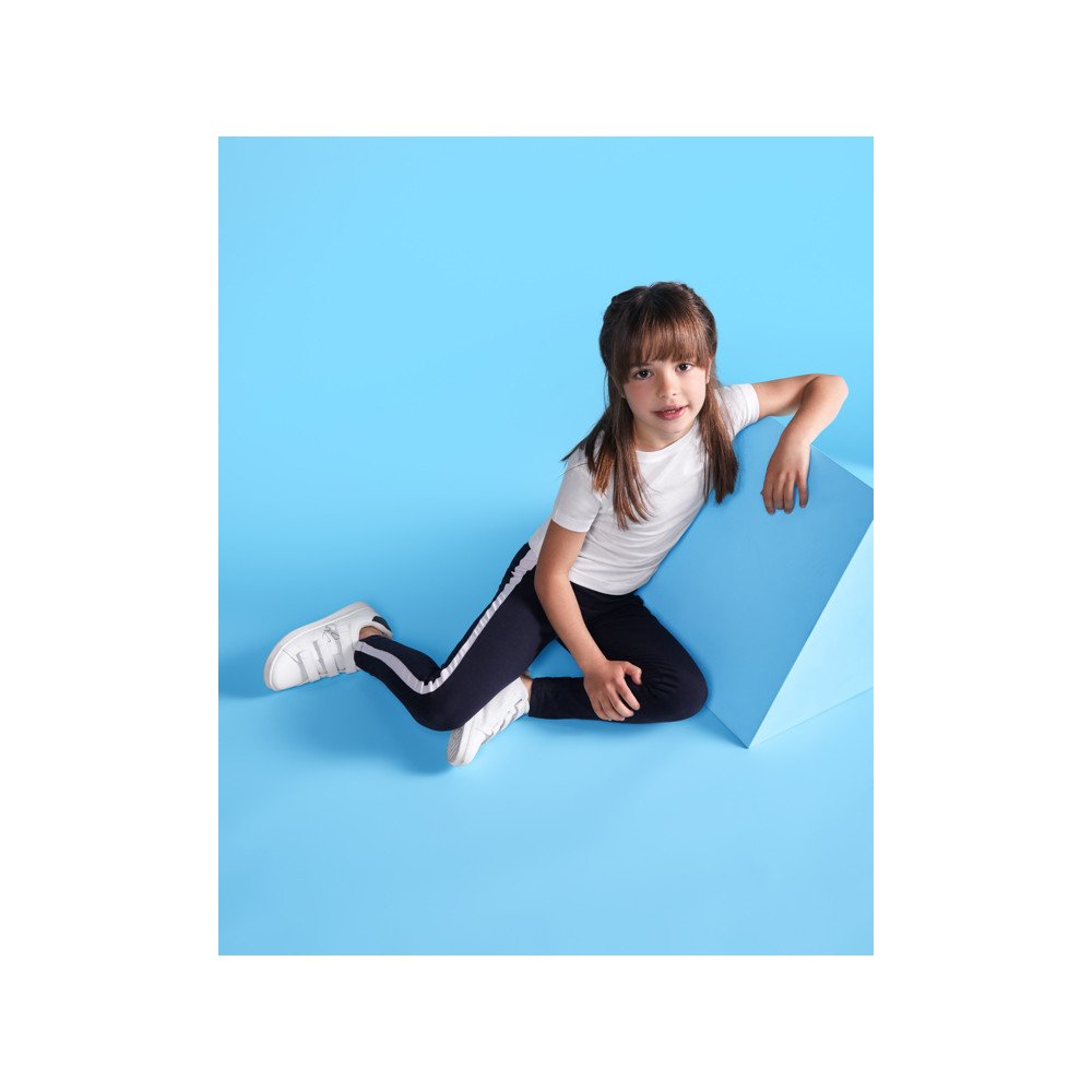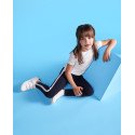 Women's long sports leggings with elastic waistband and contrasting side stripes.