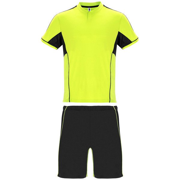 Breathable two-piece sports set. Unisex. 3-fabric combination for greater performance. Soft and comfortable main fabric and microperforated fabric on sleeves for greater breathability. Mandarin collar with snap clasp button. Shorts in contrasting bright trims and inner leg. Adjustable waistband with drawcord.