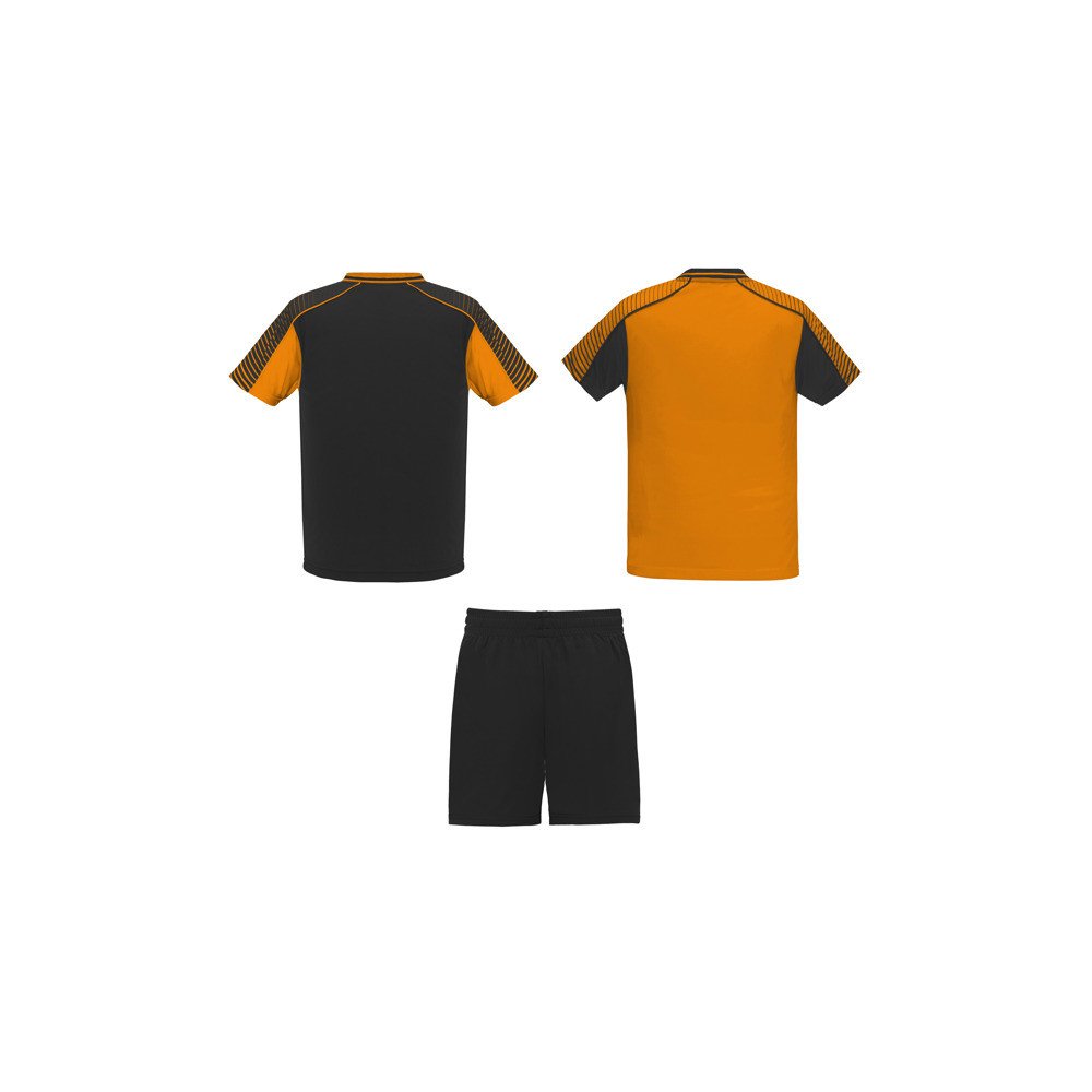 Unisex sports set consisting of 2 t-shirts + 1 pair of shorts.1. T-shirts with printed semi-raglan sleeves.2. Crew neck with tricot on the back.3. The colour of the second t-shirt is designed in the opposite way.4. Elastic waistband in shorts with matching inner drawcord with security stitching.5. Shorts with contrasting side stripe and slits on hem.