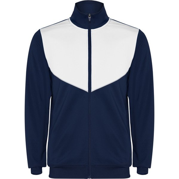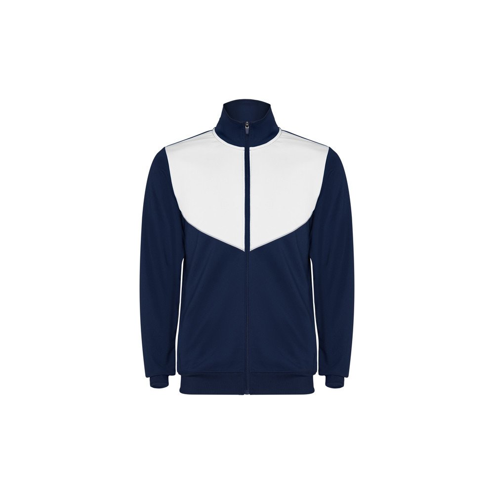 Tracksuit in lightweight and elastic fabric.·Jacket with contrasting colour and sewing trims on chest.· High collar with contrasting seams.· Central zip· Side pockets.· 2x2 ribbed cuffs and waist.· Trousers with elastic waistband and drawstring. · Contrasting side piece with sewing trim. · Zipped hem.