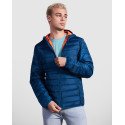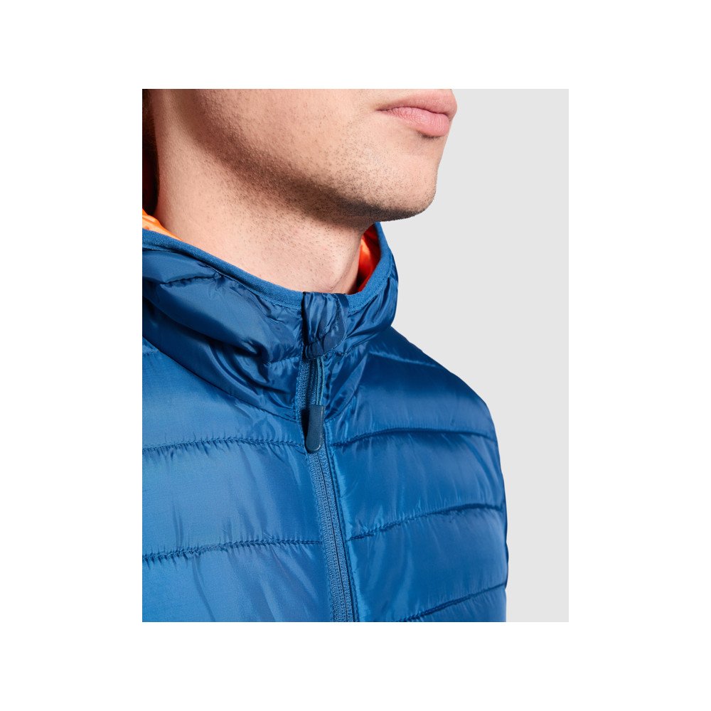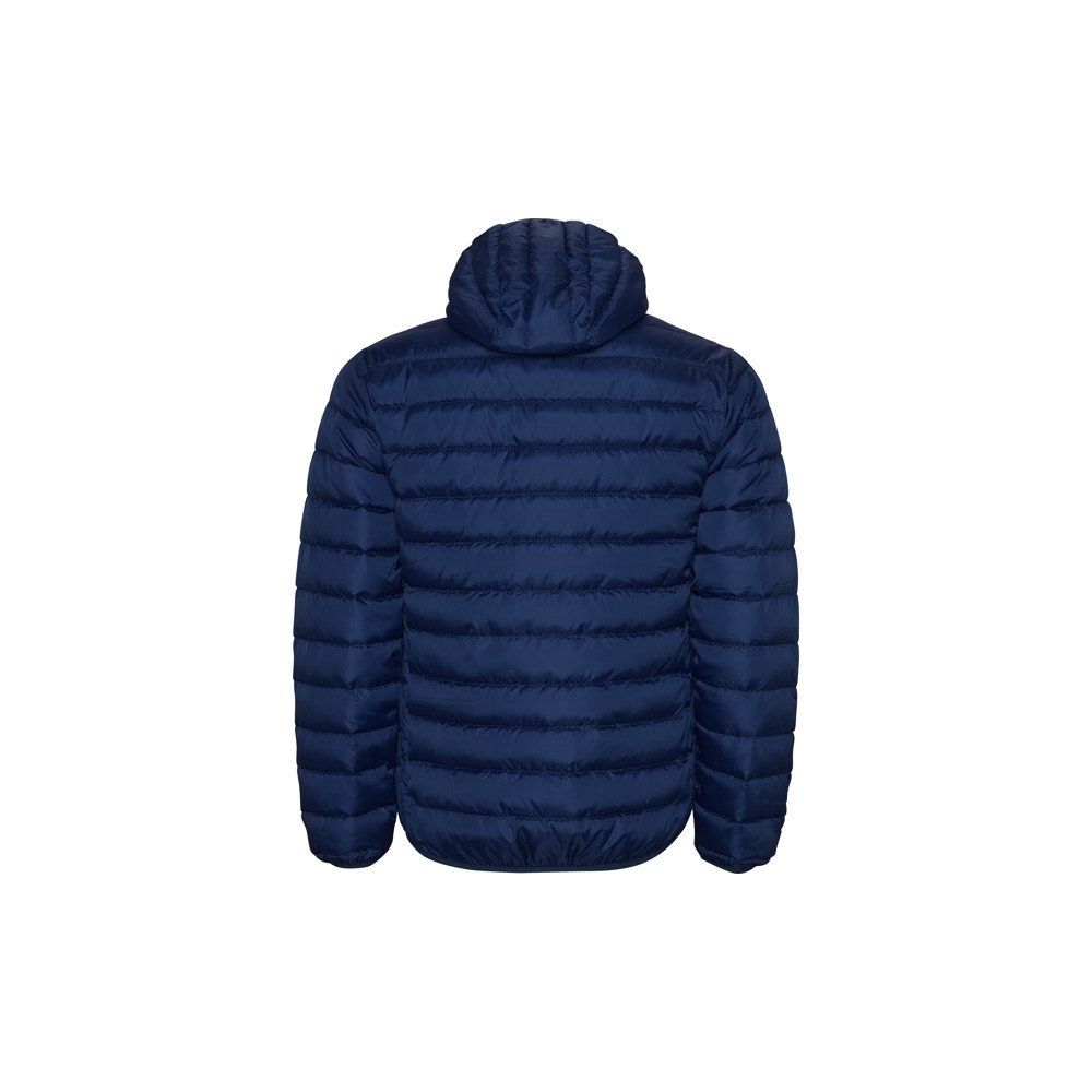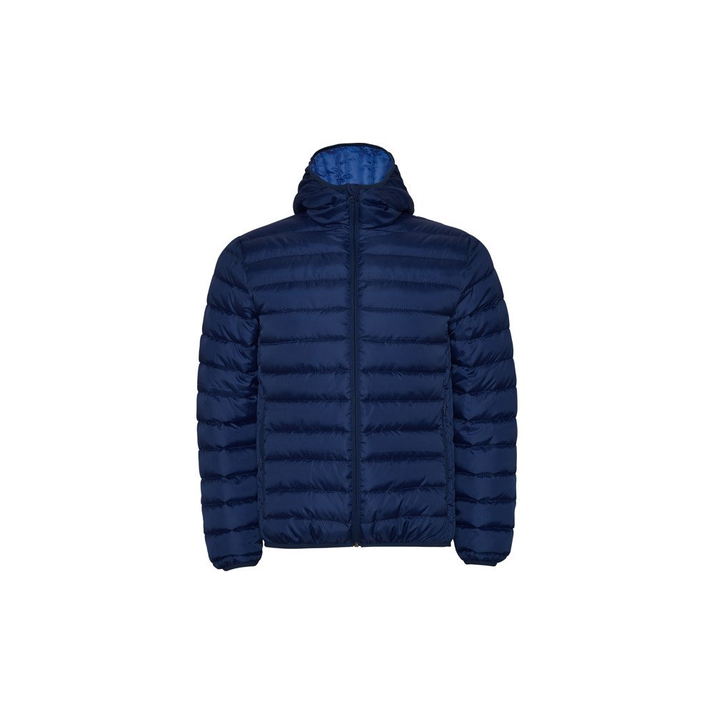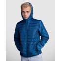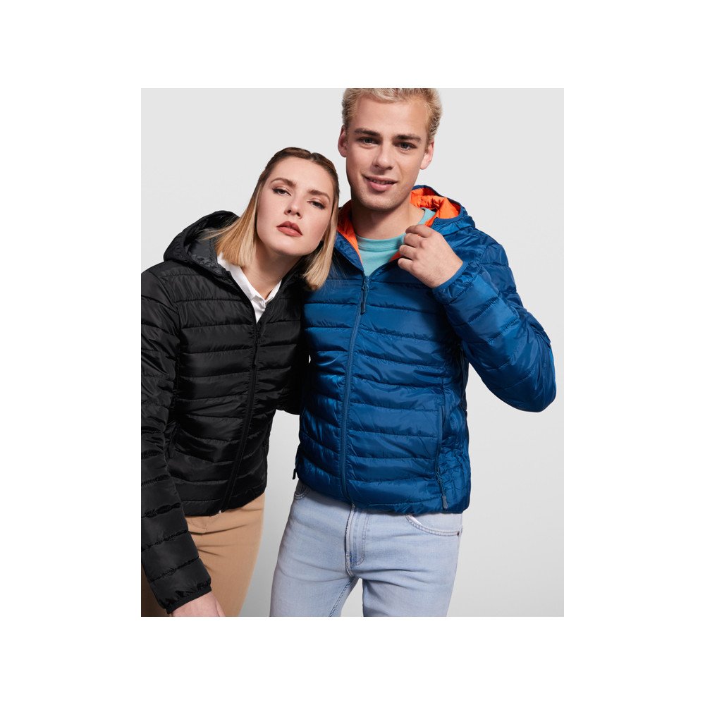 Quilted jacket with feather touch filling and hood.Inverted zips with matching chin protector and puller.Two side pockets with zip.Matching elastic trim in cuffs, hem and hood.Contrasting inner lining.Light and foldable garment.