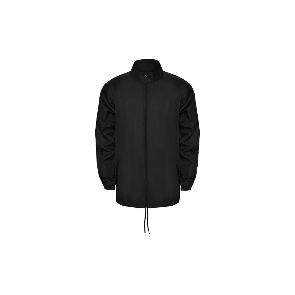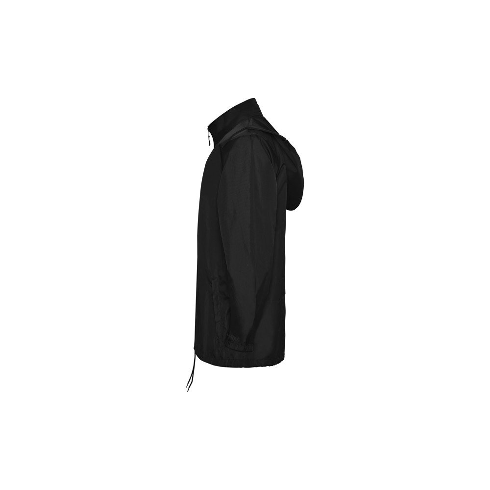 Waterproof raincoat.High neck and foldable hood with adjustable drawcord.Front zipper with matching puller.Two side pockets with flap.Elastic cuffs.Hem with inner adjustable drawcord.Elastic trim inside the pocket for folding and storage.