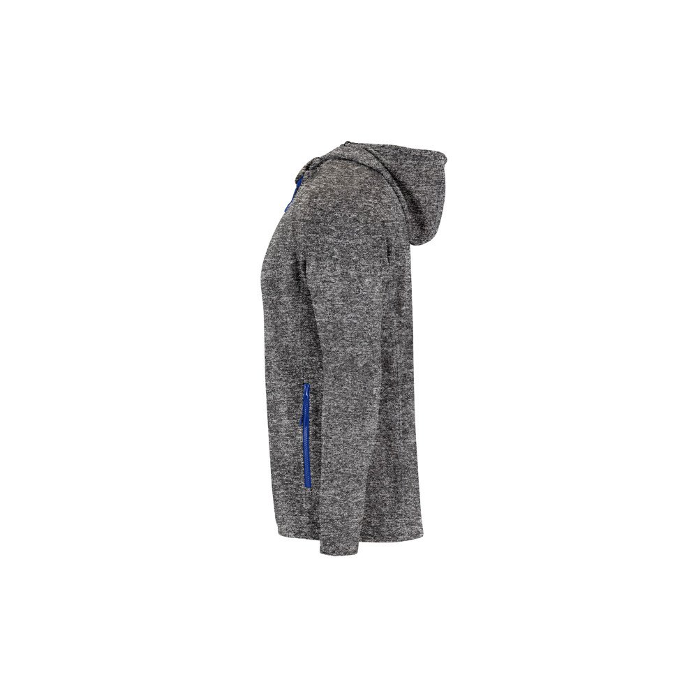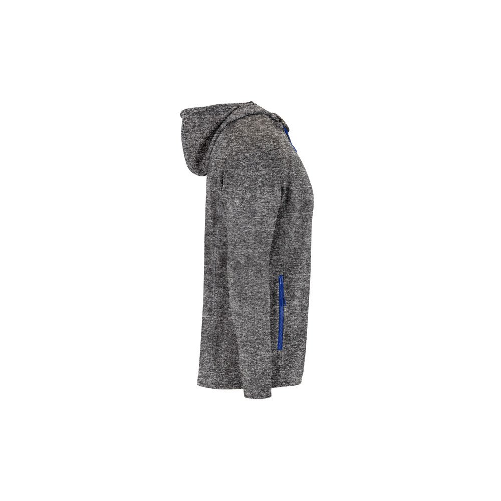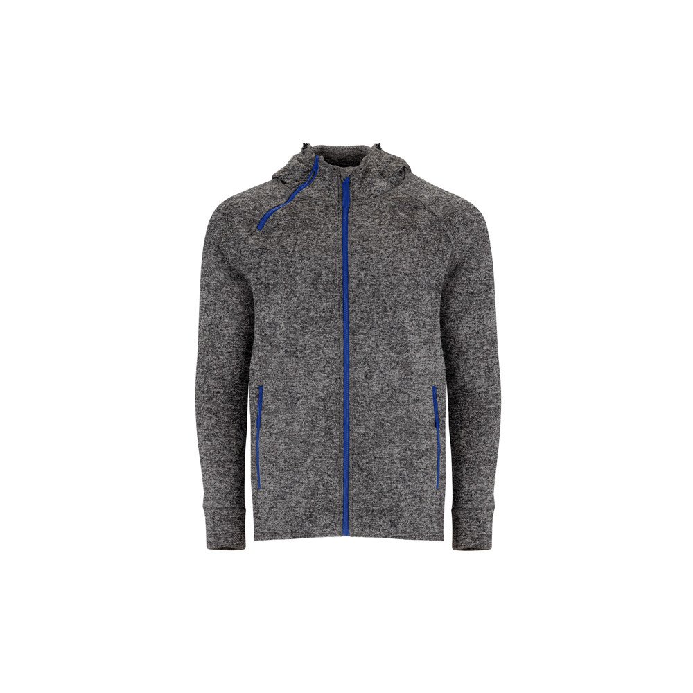 Plush knitted sweat jacket with hood.1. Injected zips with design pullers.2. Central zip with chin protector.3. High neck with design adjusters and covered seams.4. Second decorative zip on neck for easy opening.5. Two front pockets with zip.6. Back side longer than the front with design adjusters.