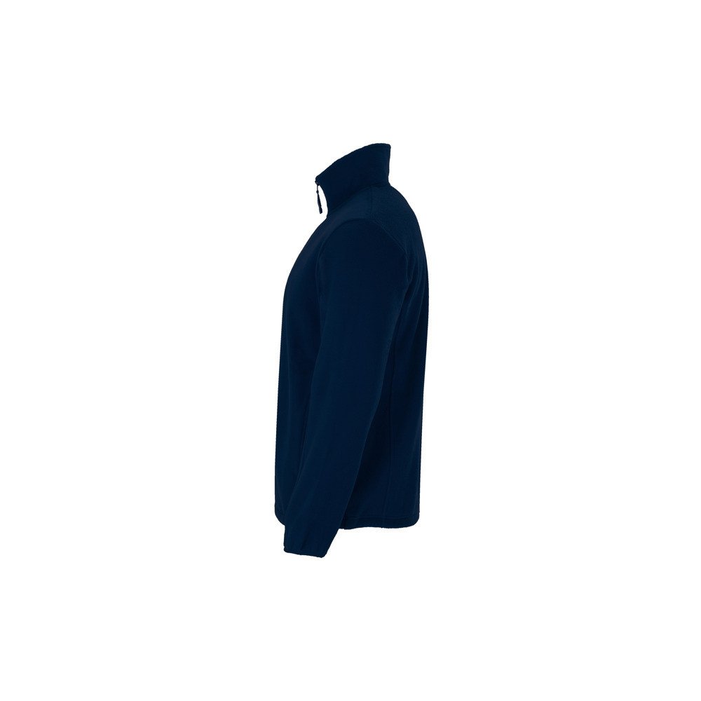 Fleeced jacket with high lined collar and matching reinforced covered seams. Injected zip with matching puller made of fabric. Side pockets. Cuffs with elastic trim. Bottom hem with inner side adjusters.