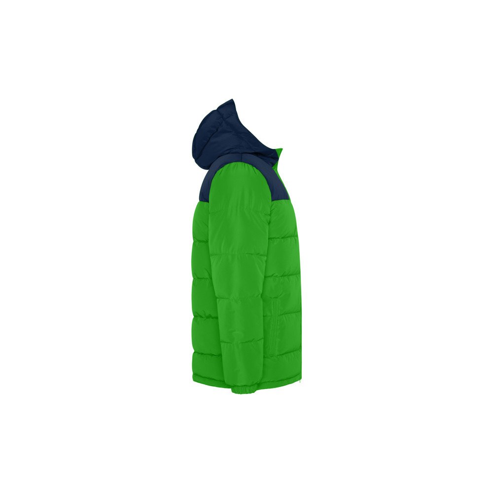 Padded jacket with fixed hood.Front zipper covered with a placket.Chin guard. Two side pockets with zip.Elastic cuffs. Internal access for reprocessing in the back and left chest.
