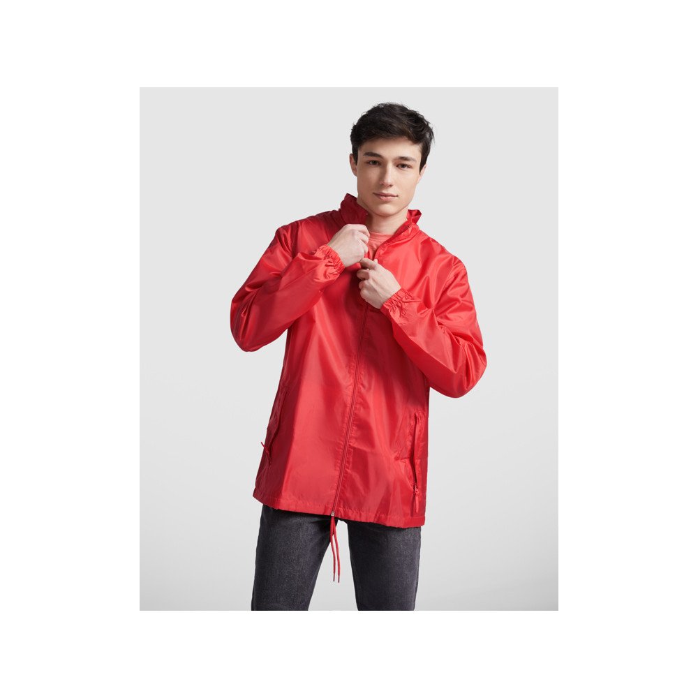 Waterproof raincoat.High neck and foldable hood with adjustable drawcord.Front zipper with matching puller.Two side pockets with flap.Elastic cuffs.Hem with inner adjustable drawcord.Elastic trim inside the pocket for folding and storage.