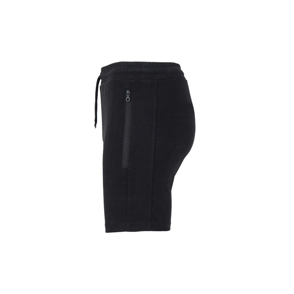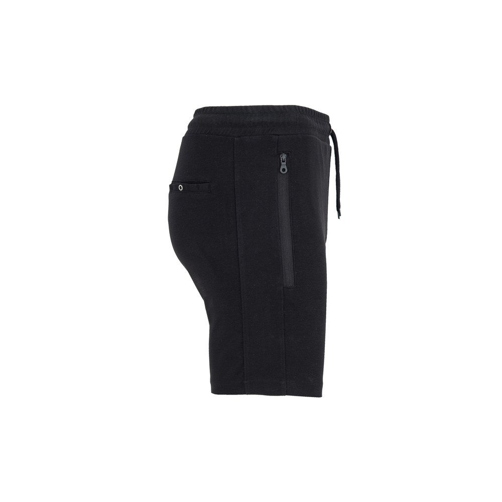 Shorts with elastic waistband and drawcord with metal eyelets. Two side pockets with inverted zips and puller. Matching side band. Sewn fly adornment. One pocket on the back with snap clasp button.