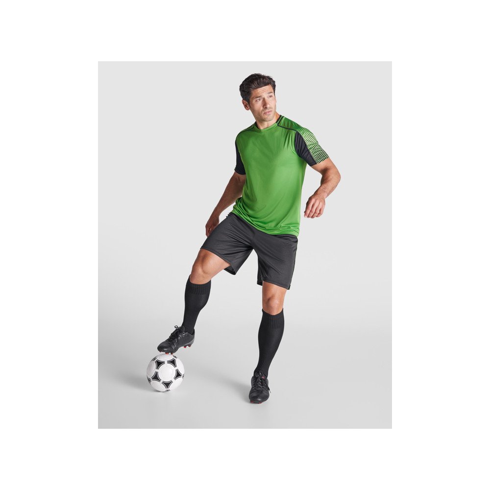 Unisex sports set consisting of 2 t-shirts + 1 pair of shorts.1. T-shirts with printed semi-raglan sleeves.2. Crew neck with tricot on the back.3. The colour of the second t-shirt is designed in the opposite way.4. Elastic waistband in shorts with matching inner drawcord with security stitching.5. Shorts with contrasting side stripe and slits on hem.