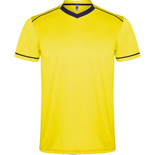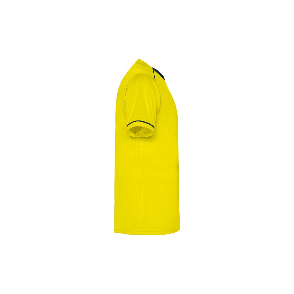 Sports set with t-shirt and shorts.1.- T-shirt with fantasy double collar in v-neck finish and reinforced covered seams.2.- Shoulder with contrasting ornamental rib.3.- Short-sleeve with contrasting ribbed slit and trim motif.4.- Shorts with elastic waistband, adjustable drawcord and safety stitching to fasten the cord.