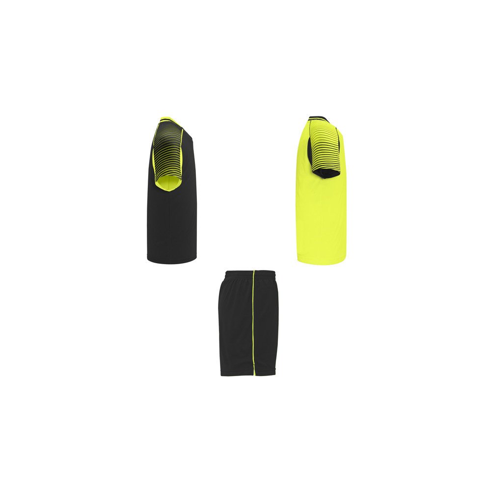 Unisex sports set consisting of 2 t-shirts + 1 pair of shorts.1. T-shirts with printed semi-raglan sleeves.2. Crew neck with tricot on the back.3. The colour of the second t-shirt is designed in the opposite way.4. Elastic waistband in shorts with matching inner drawcord with security stitching.5. Shorts with contrasting side stripe and slits on hem.