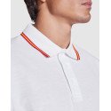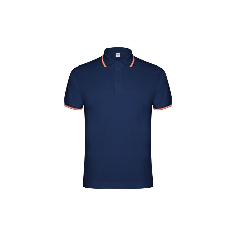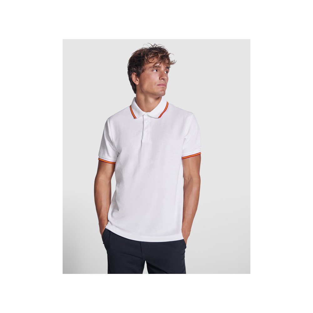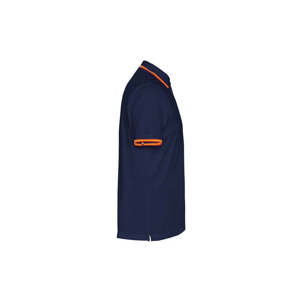 Short-sleeve polo shirt, jacquard collar and cuffs with three-button placket. Reinforced covered seams in collar. Flag motif embroidered on the back.