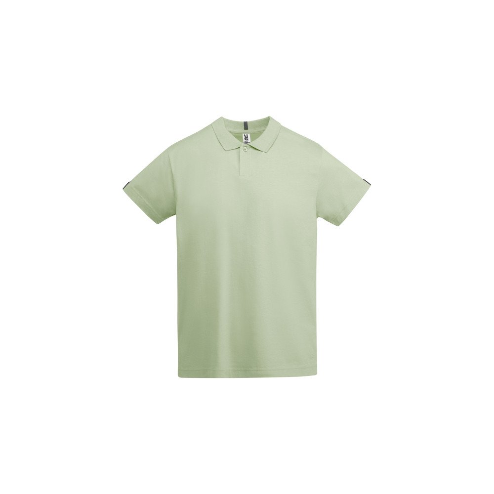 Short-sleeve polo shirt in single jersey. 1x1 ribbed collar and sleeves edging. 1-button placket. Reinforced covered seams in collar. Side slits on hem. Colour contrasting herringbone tape detail in cuffs and collar. Roly logo matching the inner fabric.