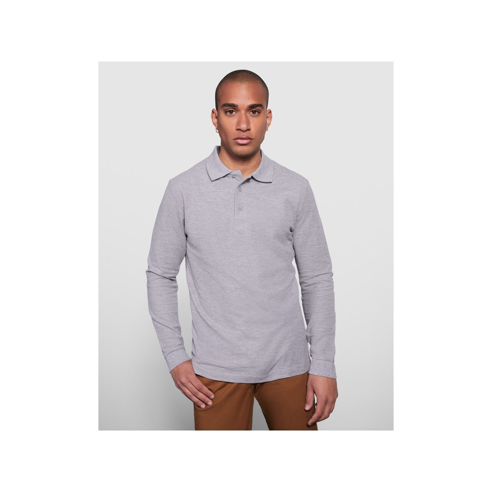 Long-sleeve polo shirt with ribbed collar and cuffs, 3-button placket and elastane 1x1 ribbed cuffs. Reinforced covered seams in collar.