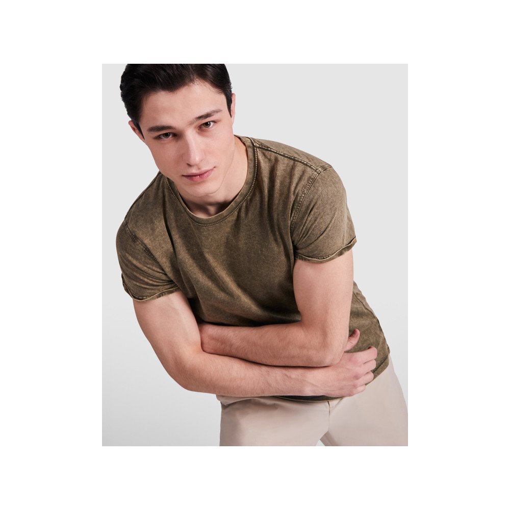 Short-sleeve t-shirt in a jeans effect design. 1x1 ribbed crew neck with interior reinforced covered seams from shoulder to shoulder. Double seam in armholes. Sleeves opening with rolled hem.