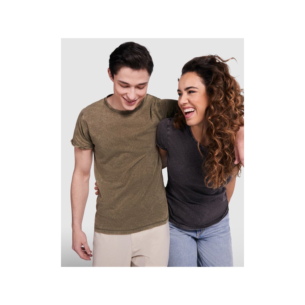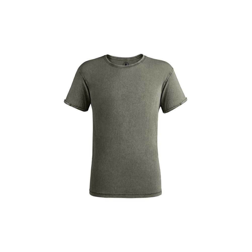 Short-sleeve t-shirt in a jeans effect design. 1x1 ribbed crew neck with interior reinforced covered seams from shoulder to shoulder. Double seam in armholes. Sleeves opening with rolled hem.