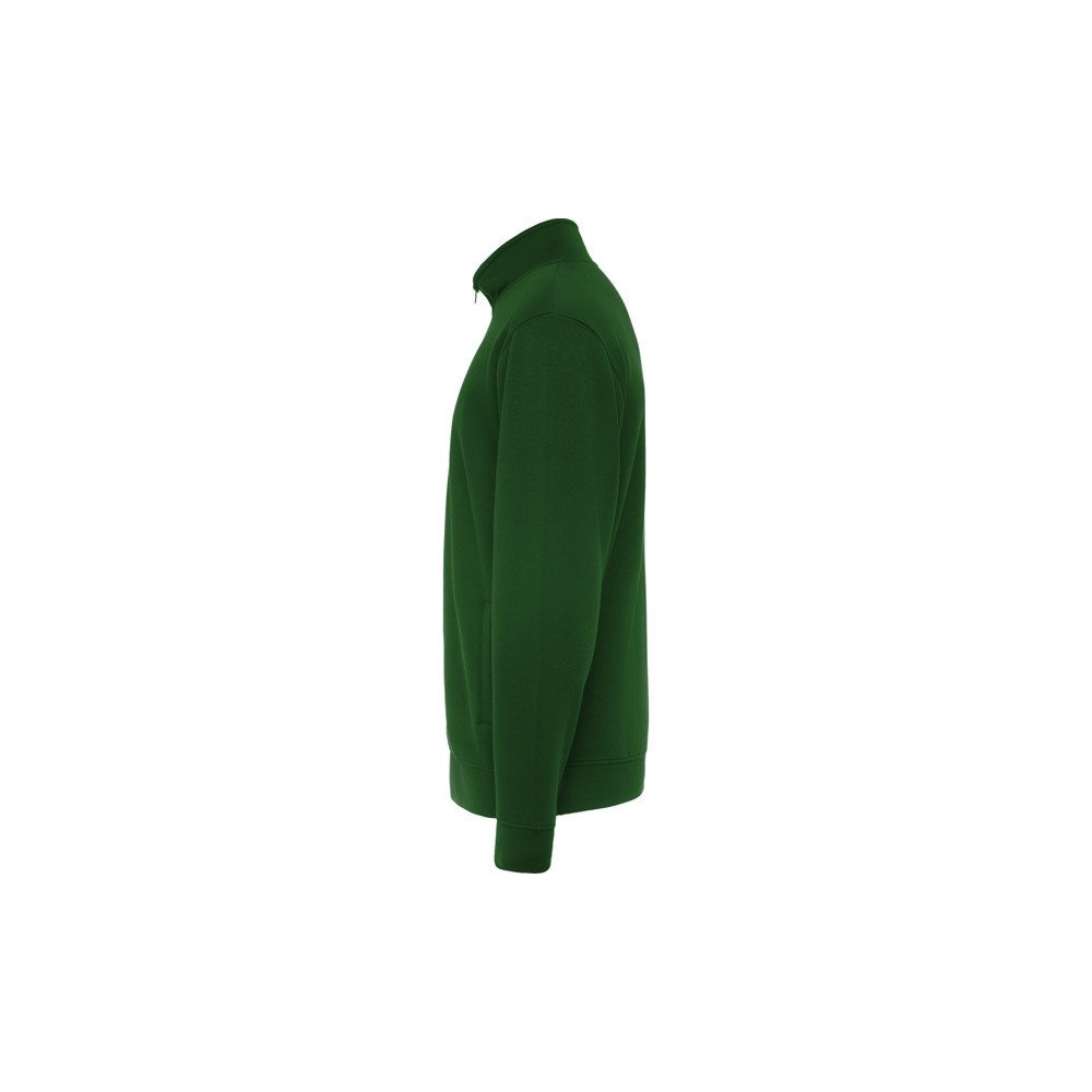 High collar sweat jacket with matching zip. Matching inner collar with reinforced covered seams. 1x1 ribbed fabric in cuffs and waist.