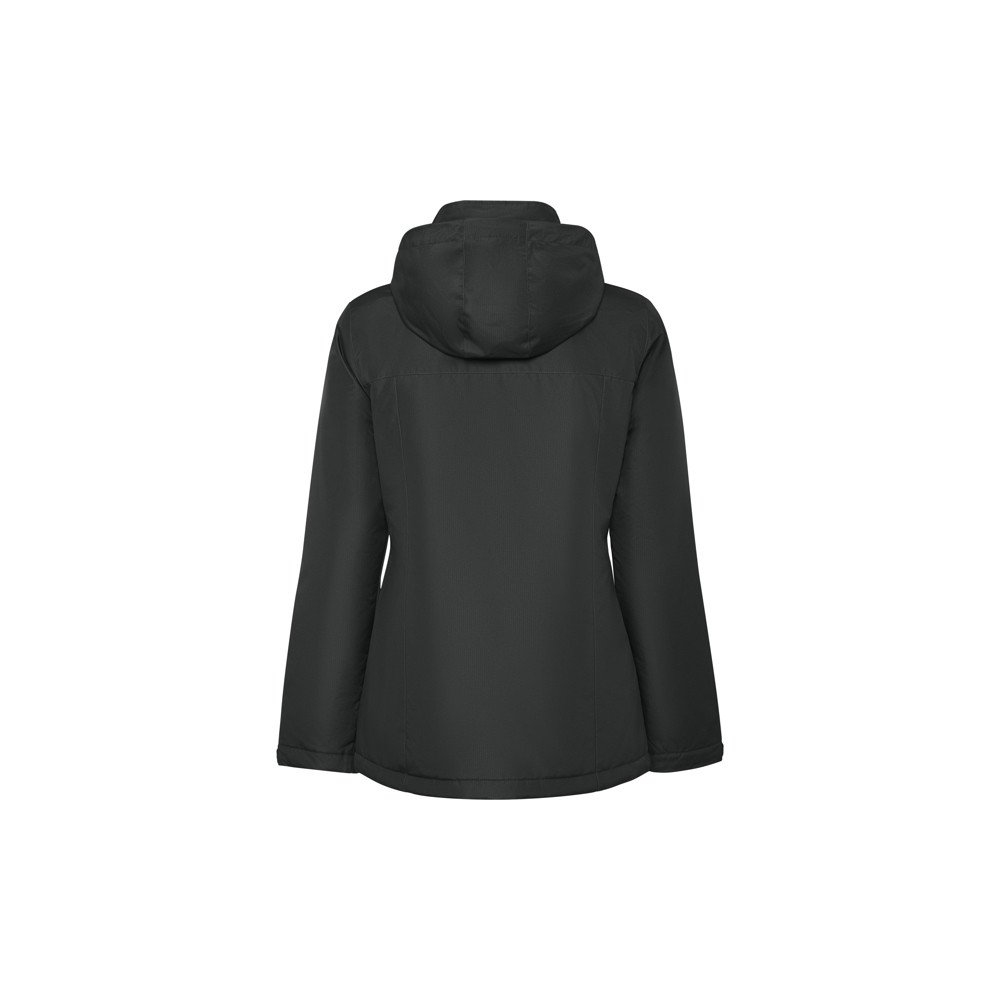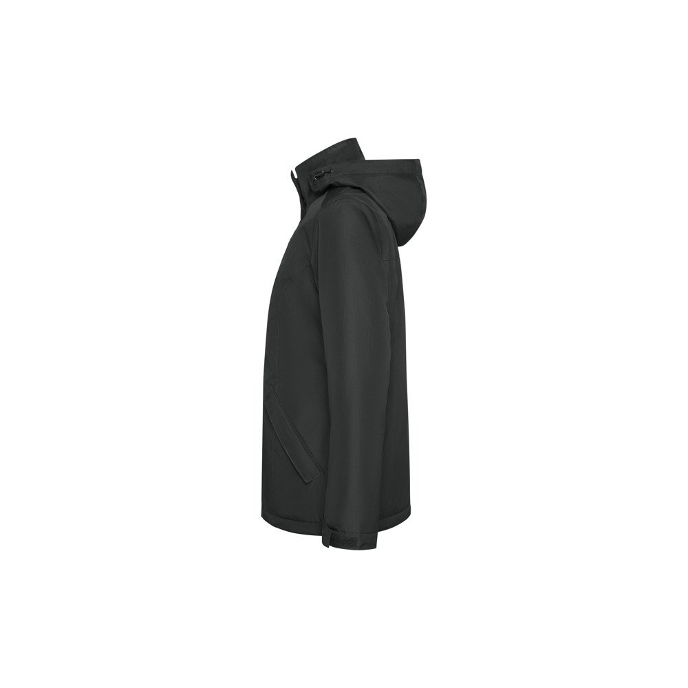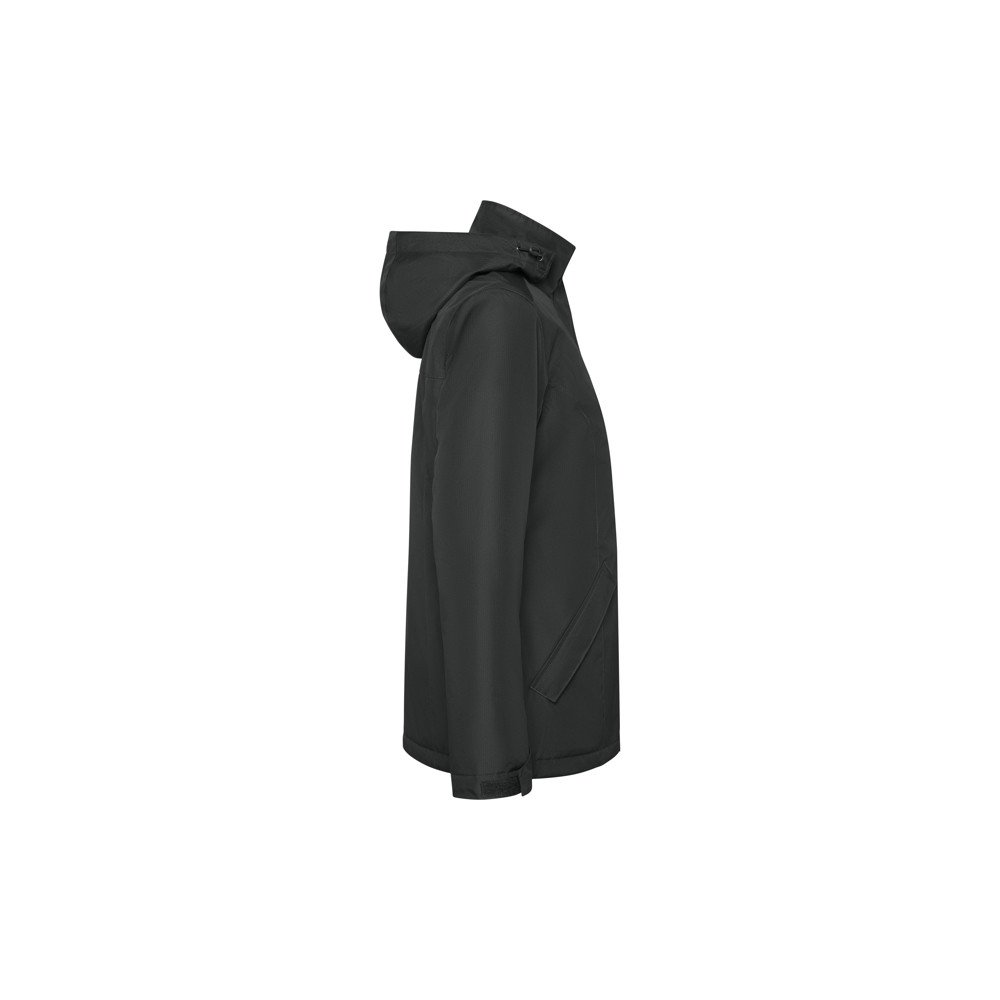 Women's waterproof fabric, slim-fitting padded parka jacket. High collar with folding hood and Velcro closure. Matching central zipper with flap. Side pockets with zipper and fixed flap. Interior pocket with Velcro closure. Adjustable cuffs with Velcro belt loop. Interior access for reinforcements on the back and left chest.