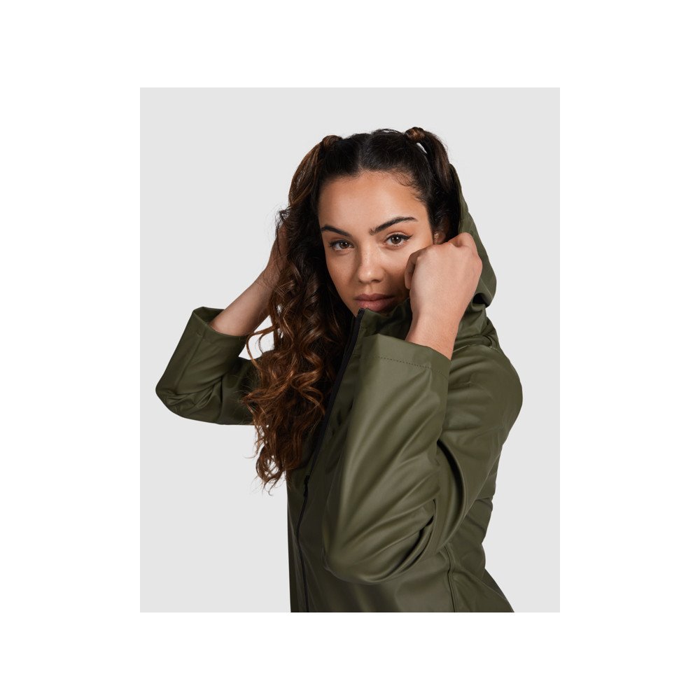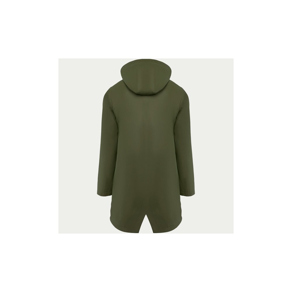 Waterproof raincoat for women.Hood with peak.Heat-sealed zips and seams. Contrasting details in black.Two side pockets with zip.Slit on back hem.