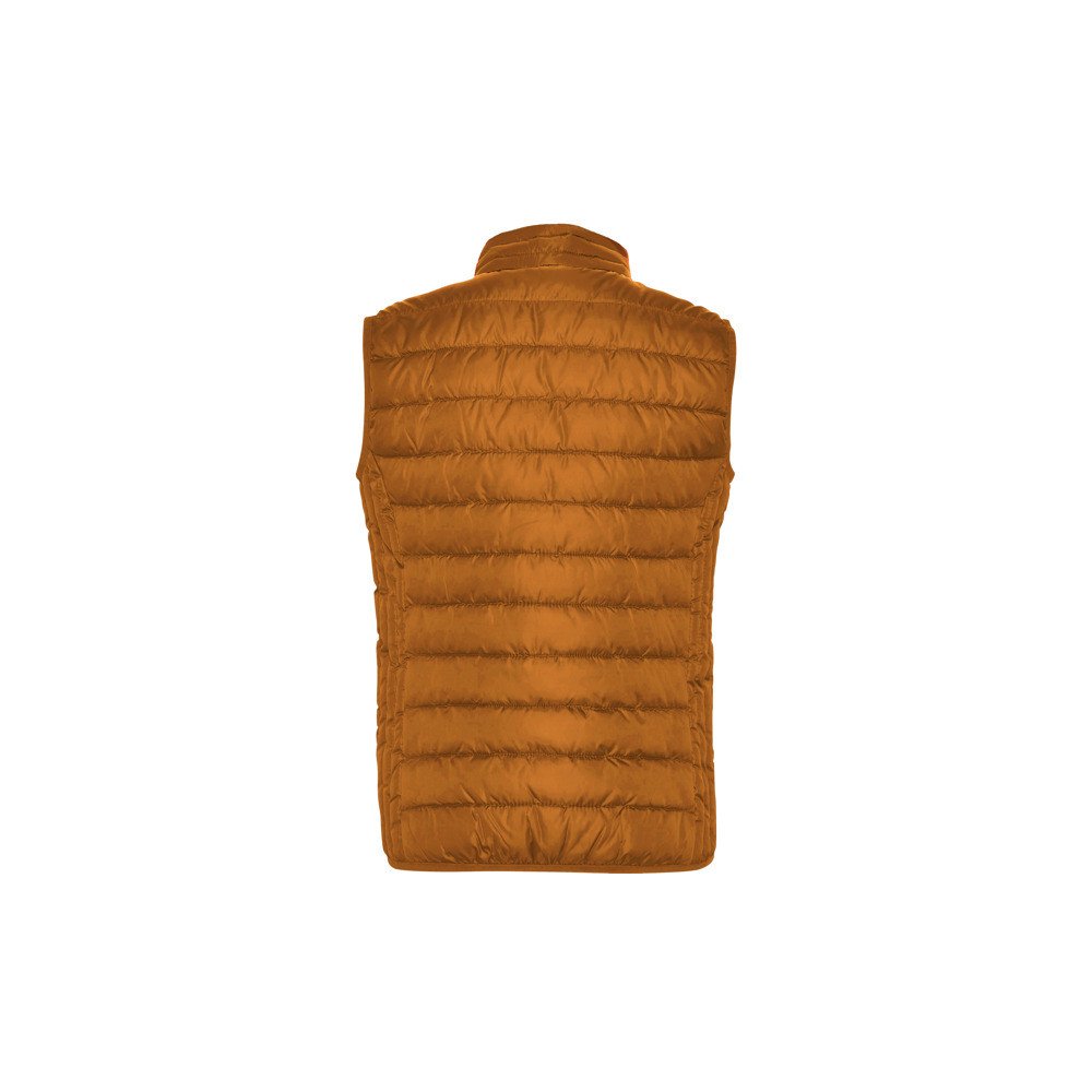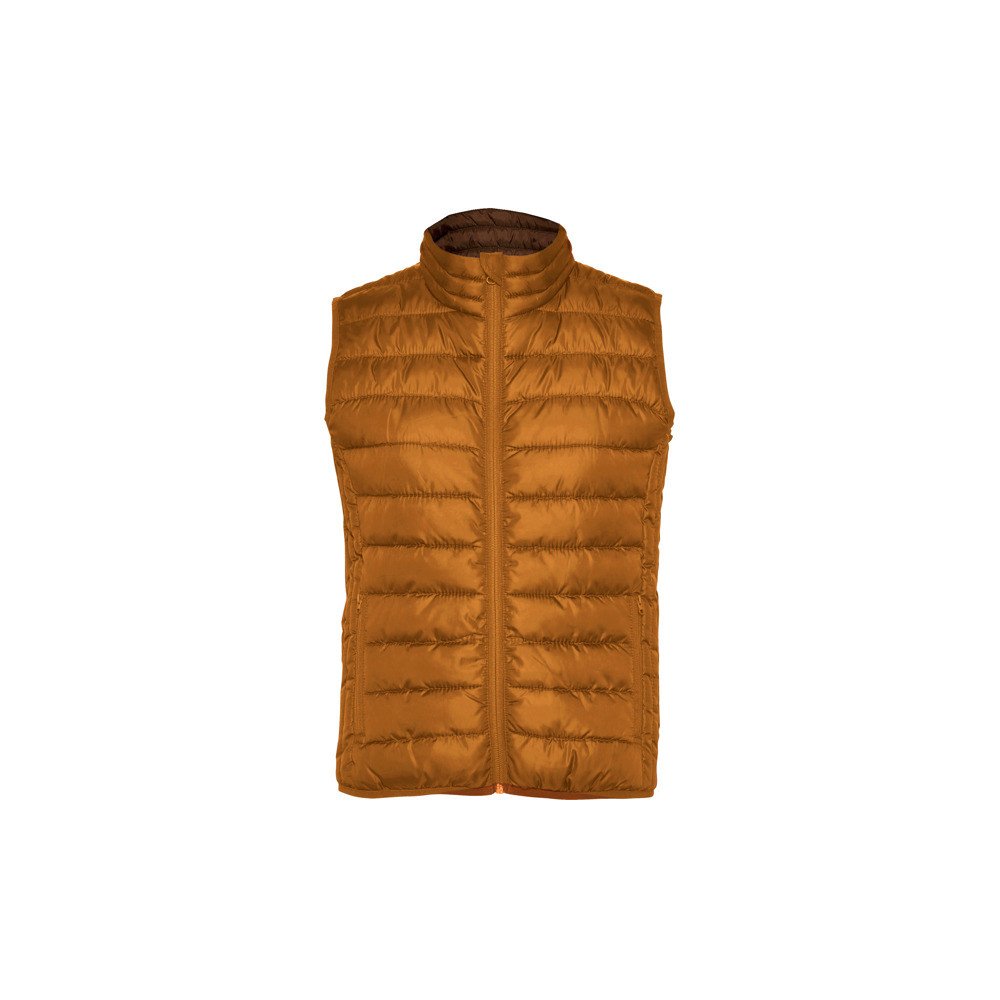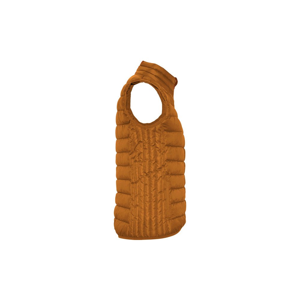 Fitted gilet vest with feather touch filling.Inverted zips with matching chin protector and puller.Two side pockets with zip.Contrasting inner lining.Matching elastic trim in hem and armholes.Light and foldable garment.