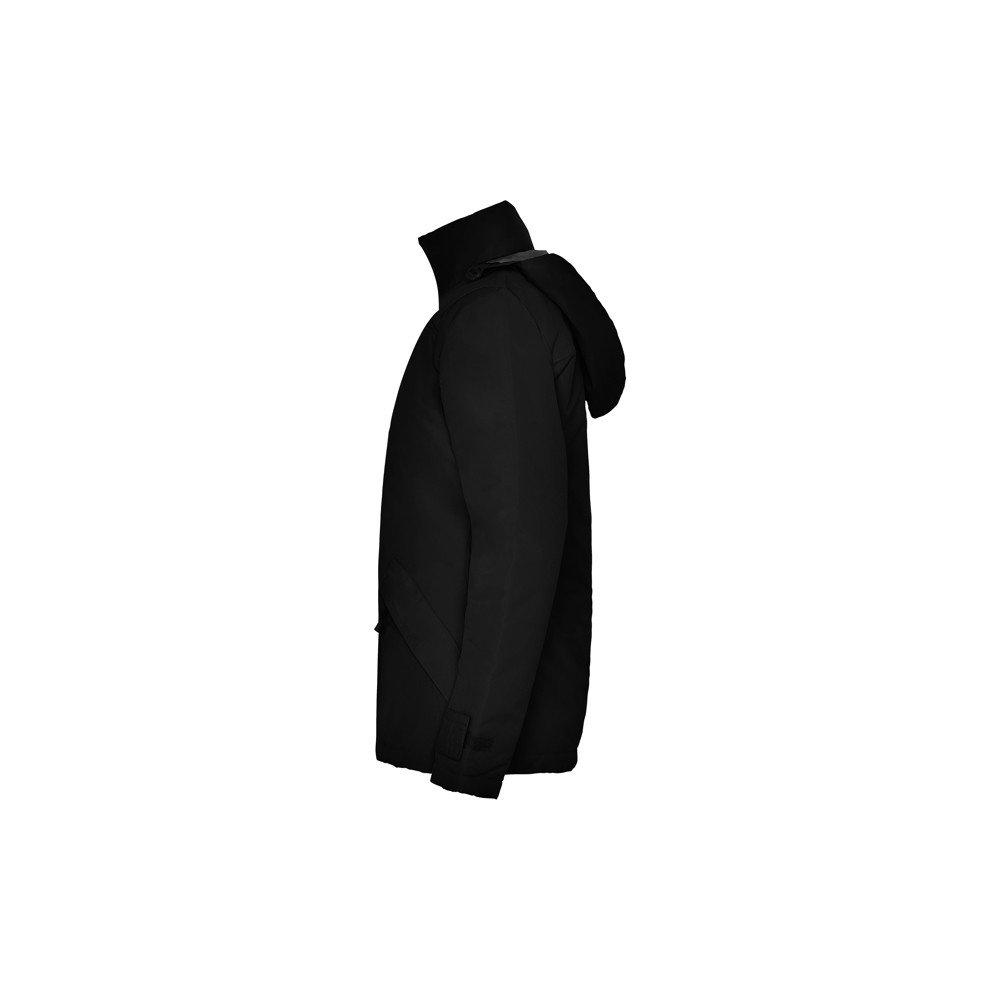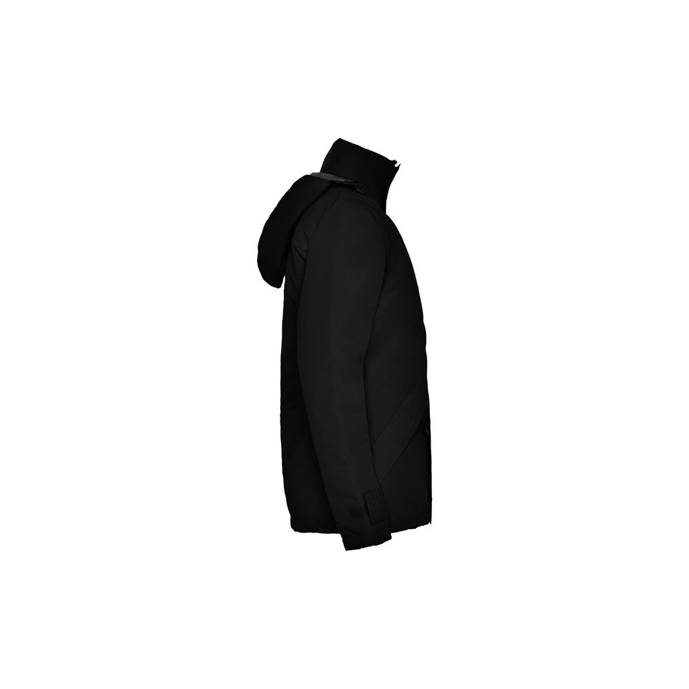 Fitted and padded waterproof jacket.· Molded central zipper with matching flap.· High neck with foldable hood.· Zippered side pockets with flap.· Two inner pockets on chest with velcro fastening.· Inner access for screen printing or embroidery.