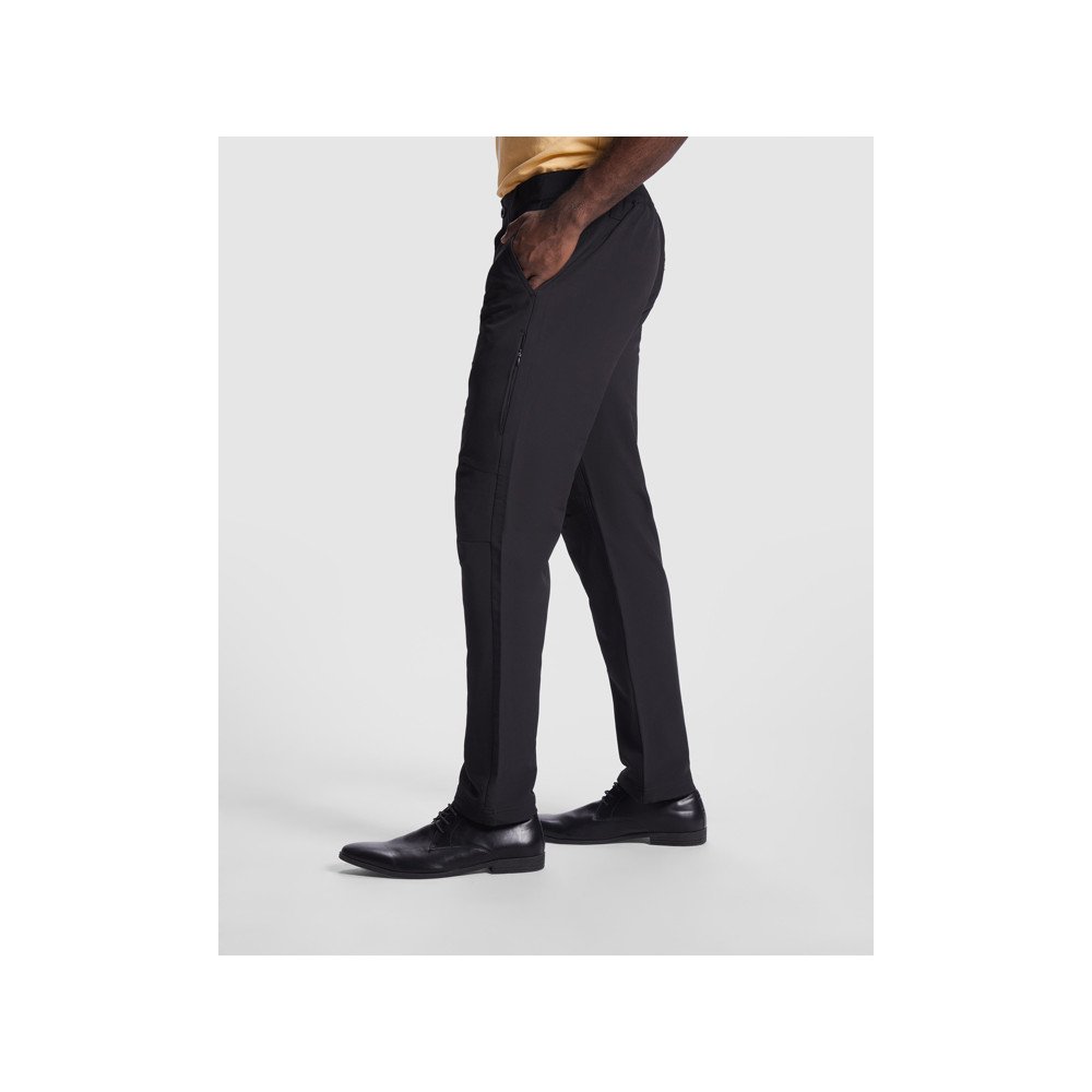 Long unisex trousers in technical fabric. · Back adjustable elastic waistband. · Belt loops. · Two side pockets in a classic cut. · Two side pockets in the seams with concealed zips. · Back pocket with press stud. · Pleats on knees. · Double seam on inner leg, crotch and hem. · PVC adjusters and elastic straps on hems.
