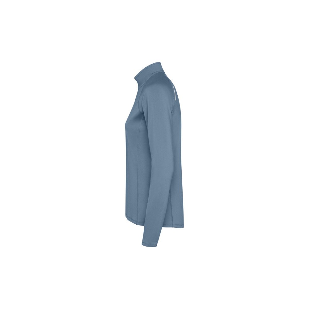 Women's long-sleeve technical raglan slim-fit sweatshirt. Collar with a half zip inverted design featuring a reflective band. Reinforced seam covers. Cuffs with thumb openings. Reflective details on the back. Back hem slightly longer than the front. Warm brushed inner fabric.