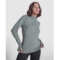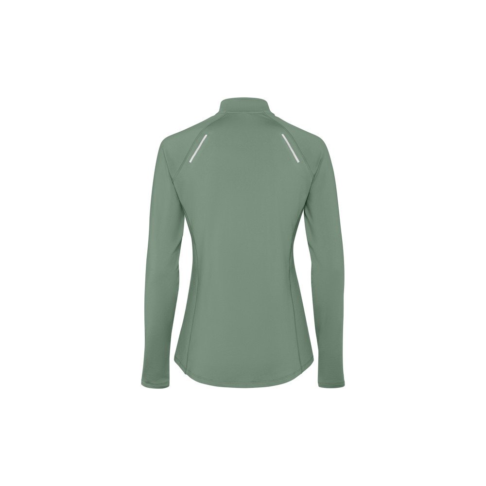 Women's long-sleeve technical raglan slim-fit sweatshirt. Collar with a half zip inverted design featuring a reflective band. Reinforced seam covers. Cuffs with thumb openings. Reflective details on the back. Back hem slightly longer than the front. Warm brushed inner fabric.