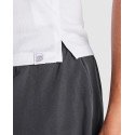 Fitted technical short-sleeve polo shirt for women in antibacterial recycled polyester. 1x1 ribbed collar and detail in sleeves edging. Reinforced covered seams in collar. Placket with 2 clasp buttons. Contrasting details and shoulders. Side slits on hem.