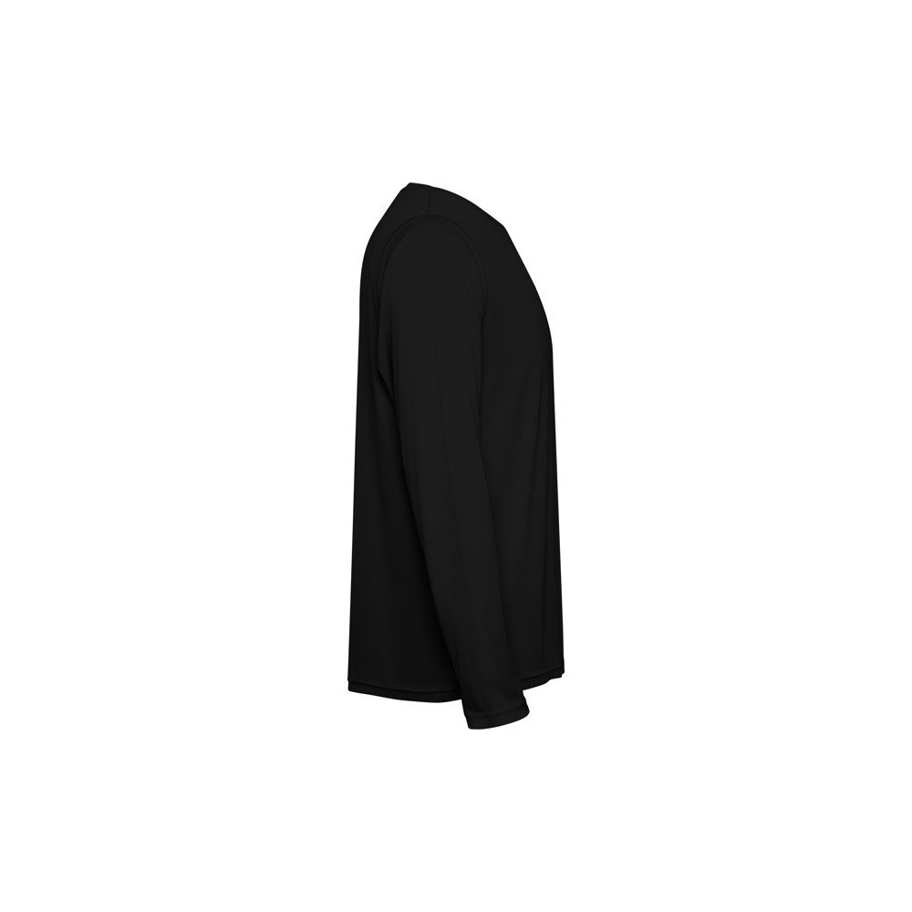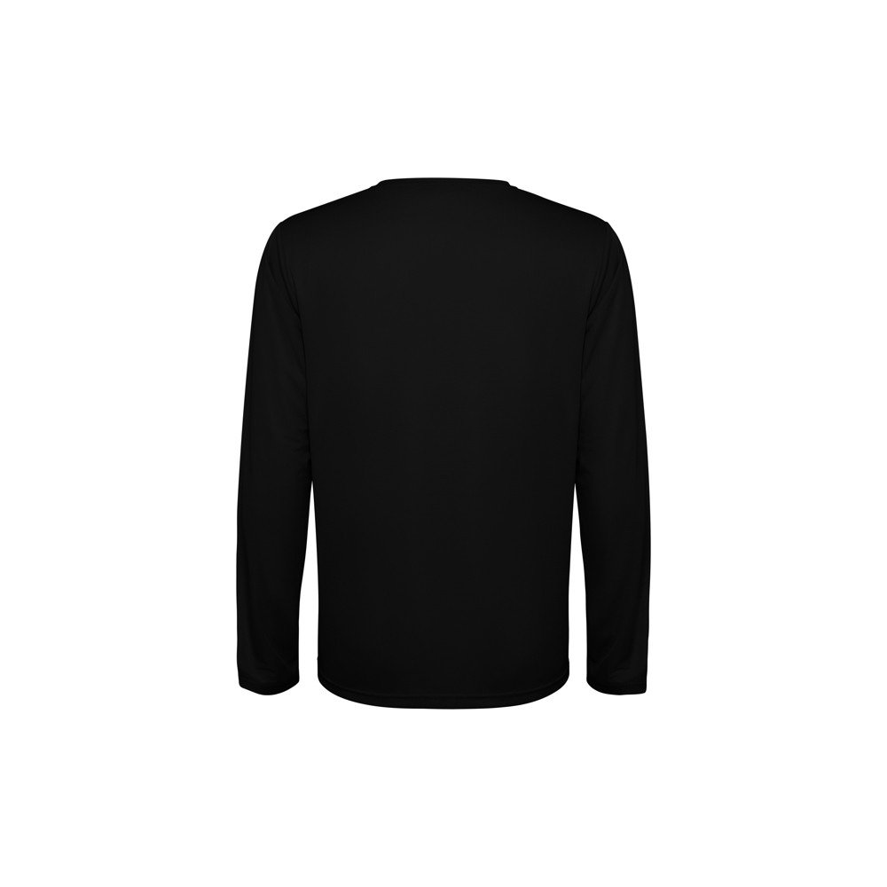 Unisex long-sleeve technical t-shirt. Collar with matching seams. Back hem slightly longer than the front. Side seams shifted forward.