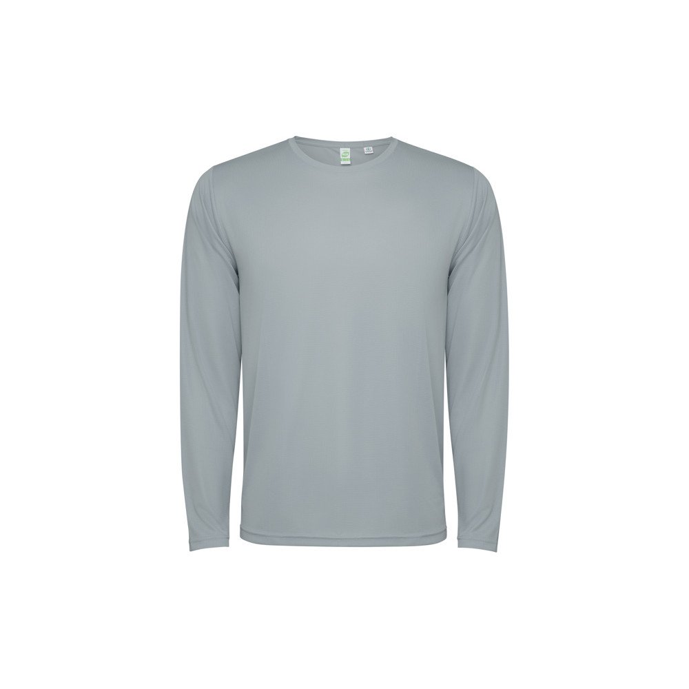 Unisex long-sleeve technical t-shirt. Collar with matching seams. Back hem slightly longer than the front. Side seams shifted forward.