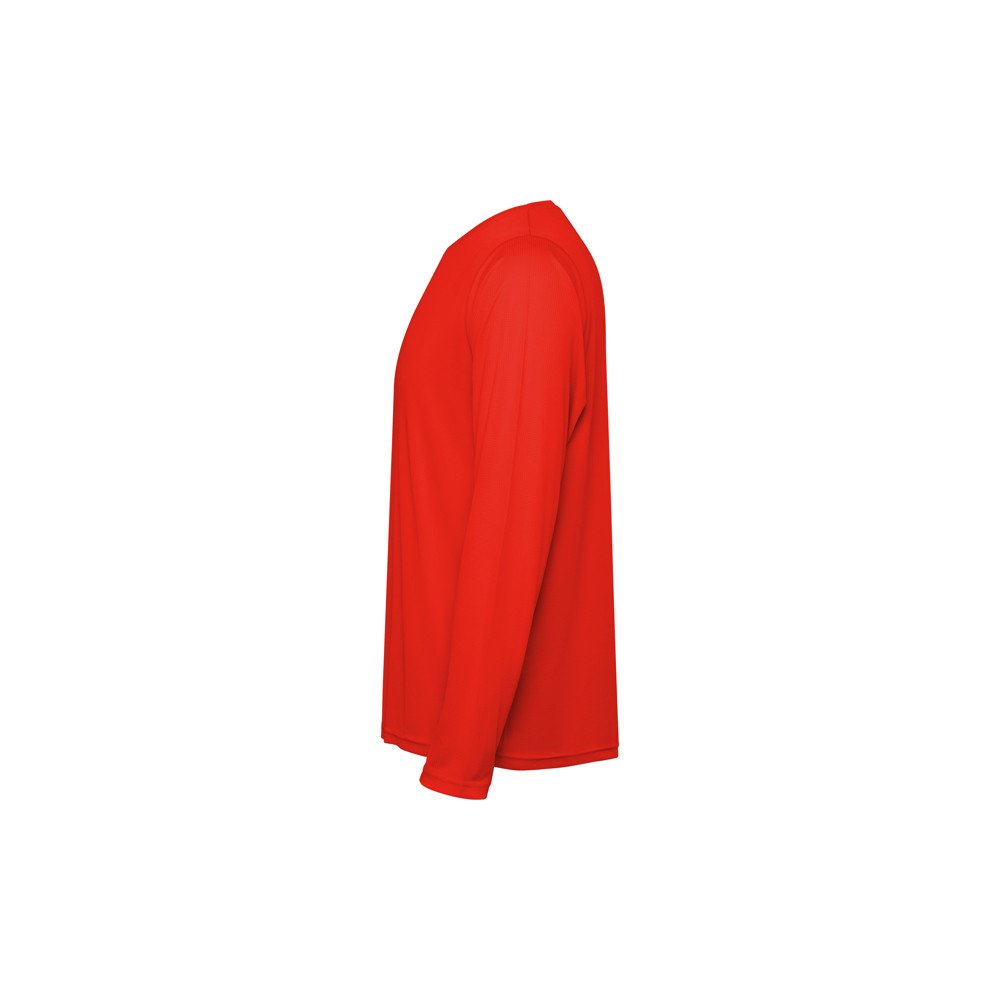 Unisex long-sleeve technical t-shirt. Collar with matching seams. Back hem slightly longer than the front. Side seams shifted forward.