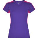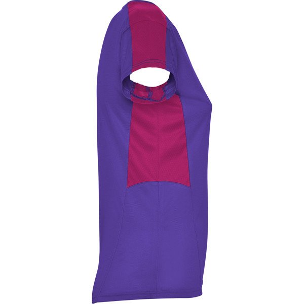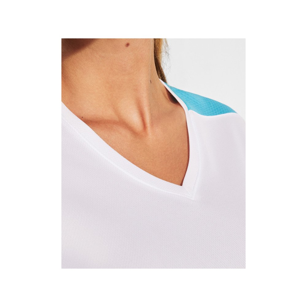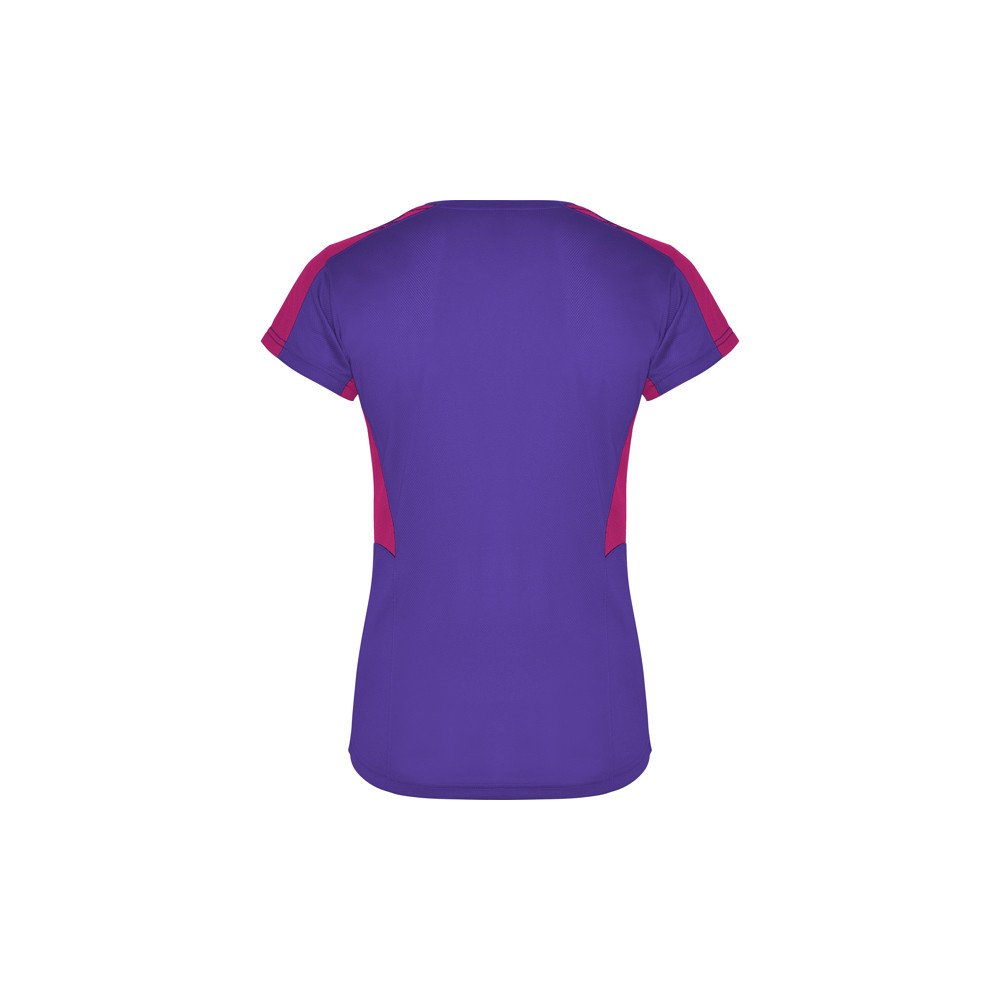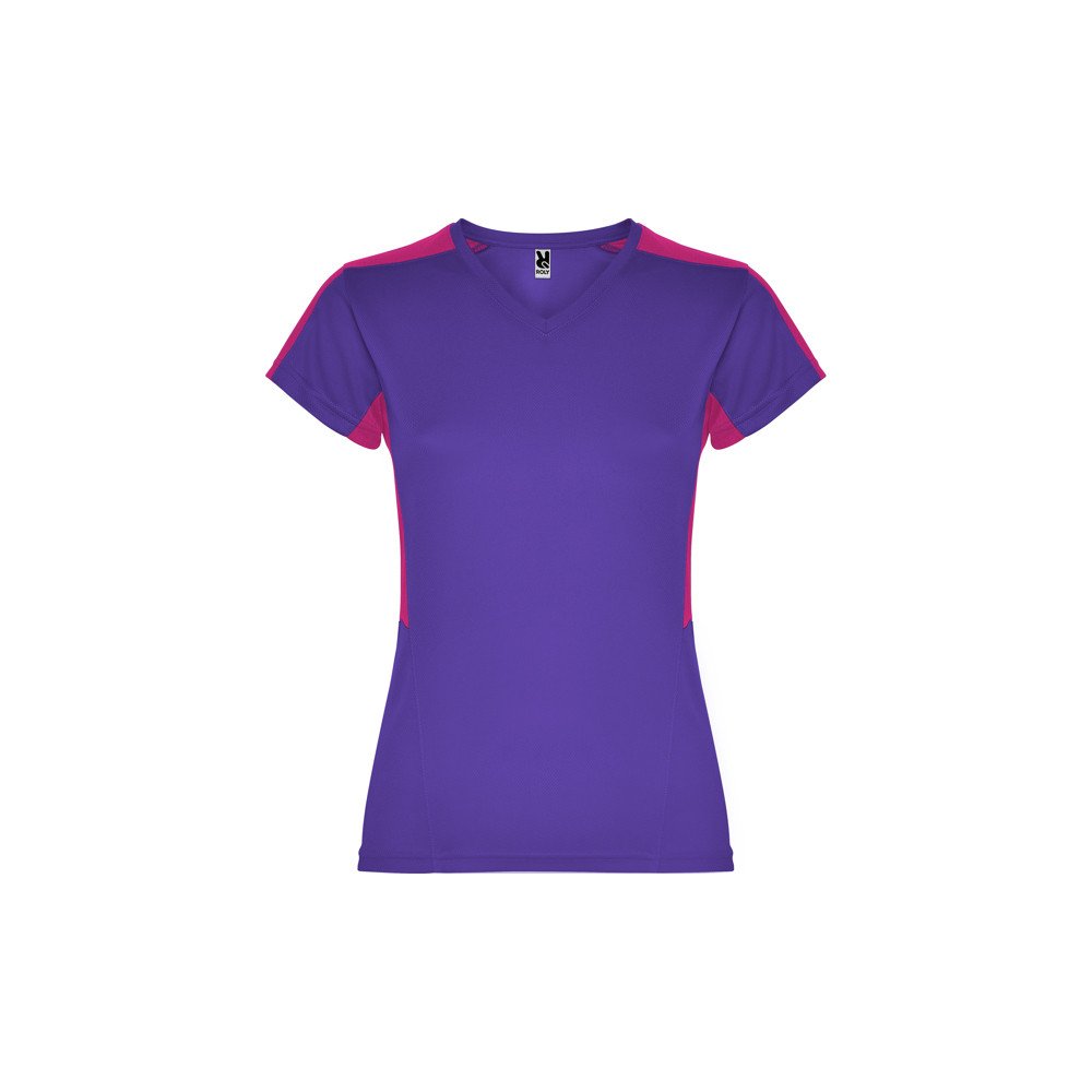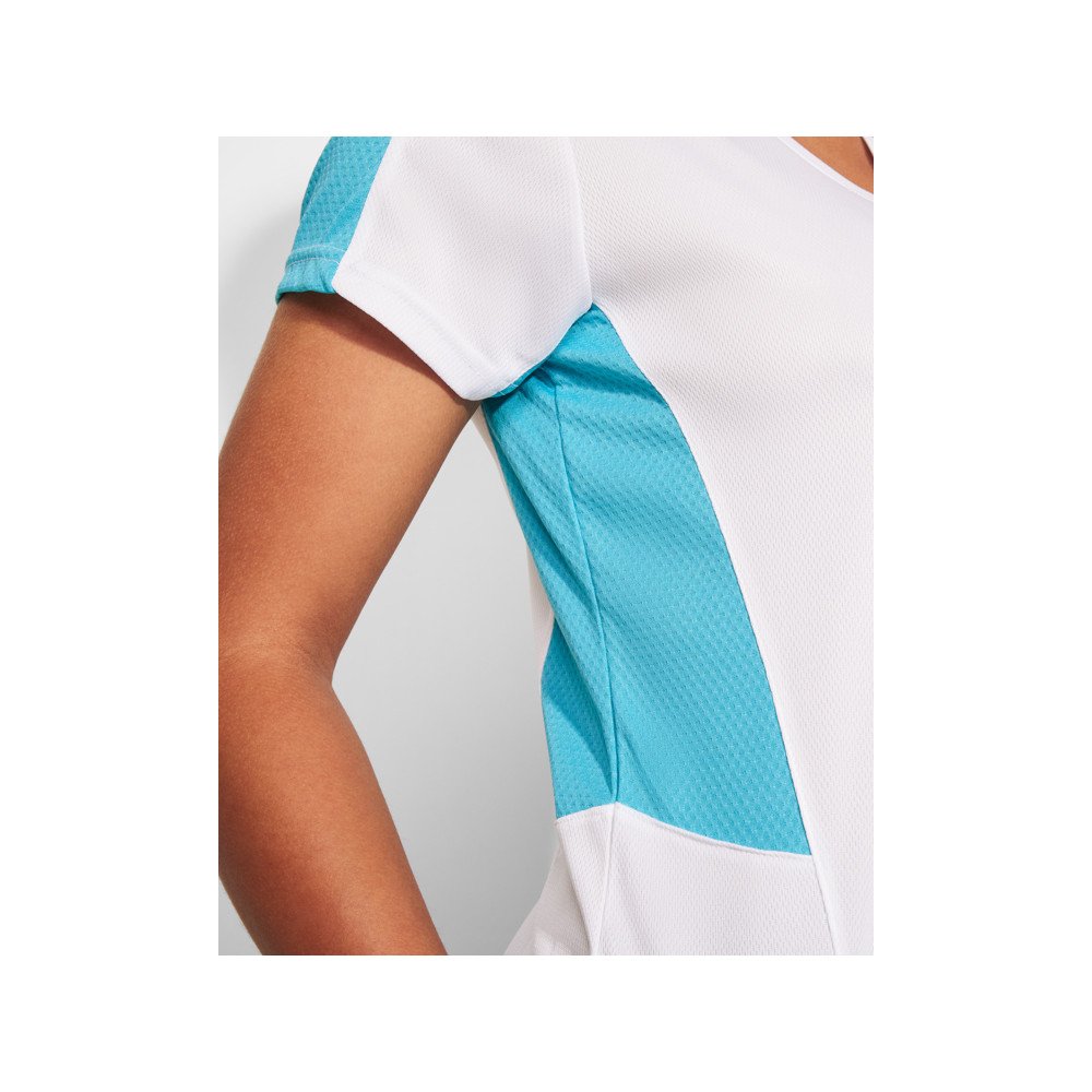 Women's short-sleeve technical t-shirt.1.- V-neck.2.- Combination of two polyester fabrics in sides and shoulders.3.- Bird's eye fabric on front and breathable 3D mesh fabric on shoulders and side panels. 4.- Fabric prepared for moisture absorption.