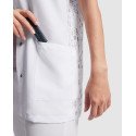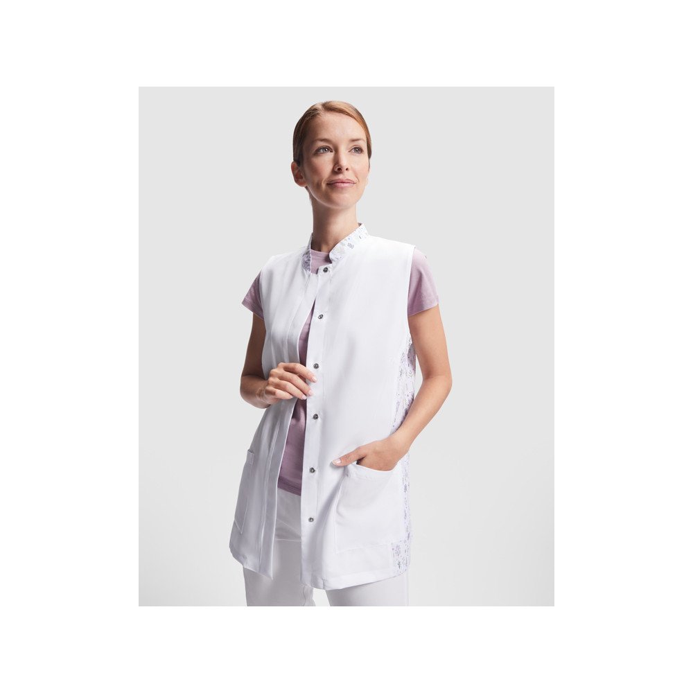 Sleeveless scrub vest. · Mandarin collar, · Front fastening with concealed press studs. . side panels and pleats on chest. · Two front patch pockets.