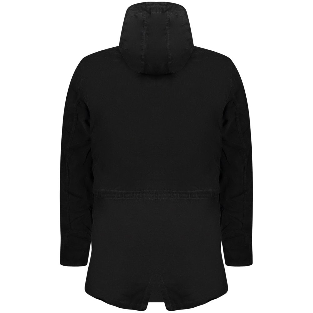 Pikkade varrukatega jakk kapuutsiga, parka, 4 välist taskut, eemaldatav lambanaha efektiga fliis sees, lukud, nupud, nupud ja nöör vööl, logo
