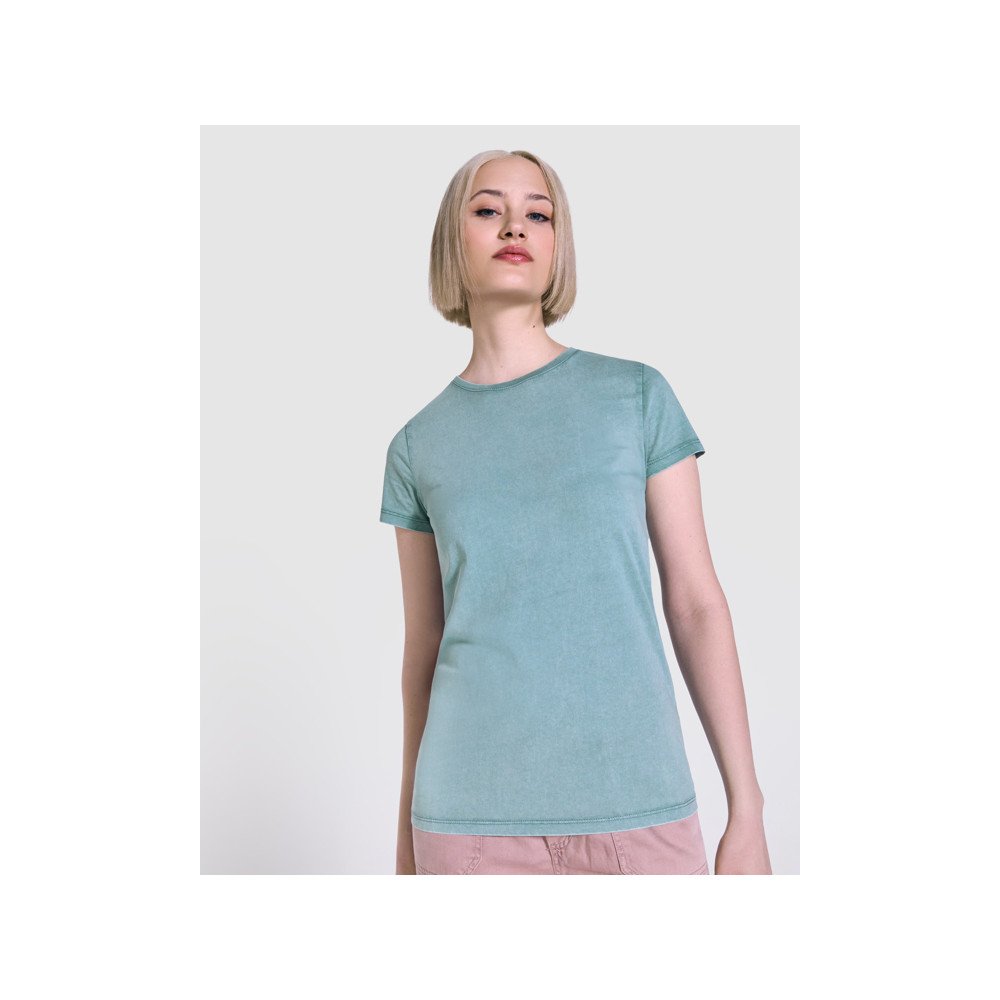 Women's short-sleeve t-shirt, 100% cotton with an acid-wash finish. 1x1 ribbed crew neck and side seams. Tone-on-tone coverstitch at the neck.