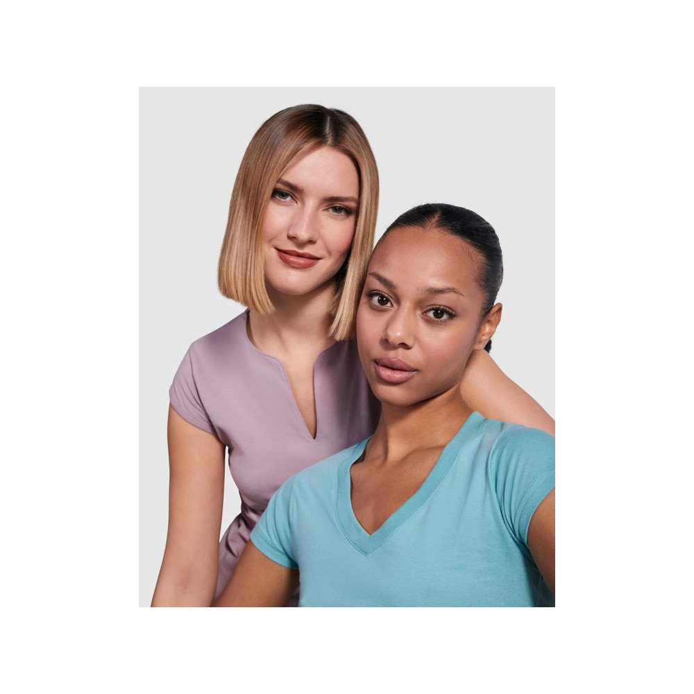 Pehme ja ümar kaelus ning V-avaga T-särk. Kärbitud varrukas. Küljeõmblused.