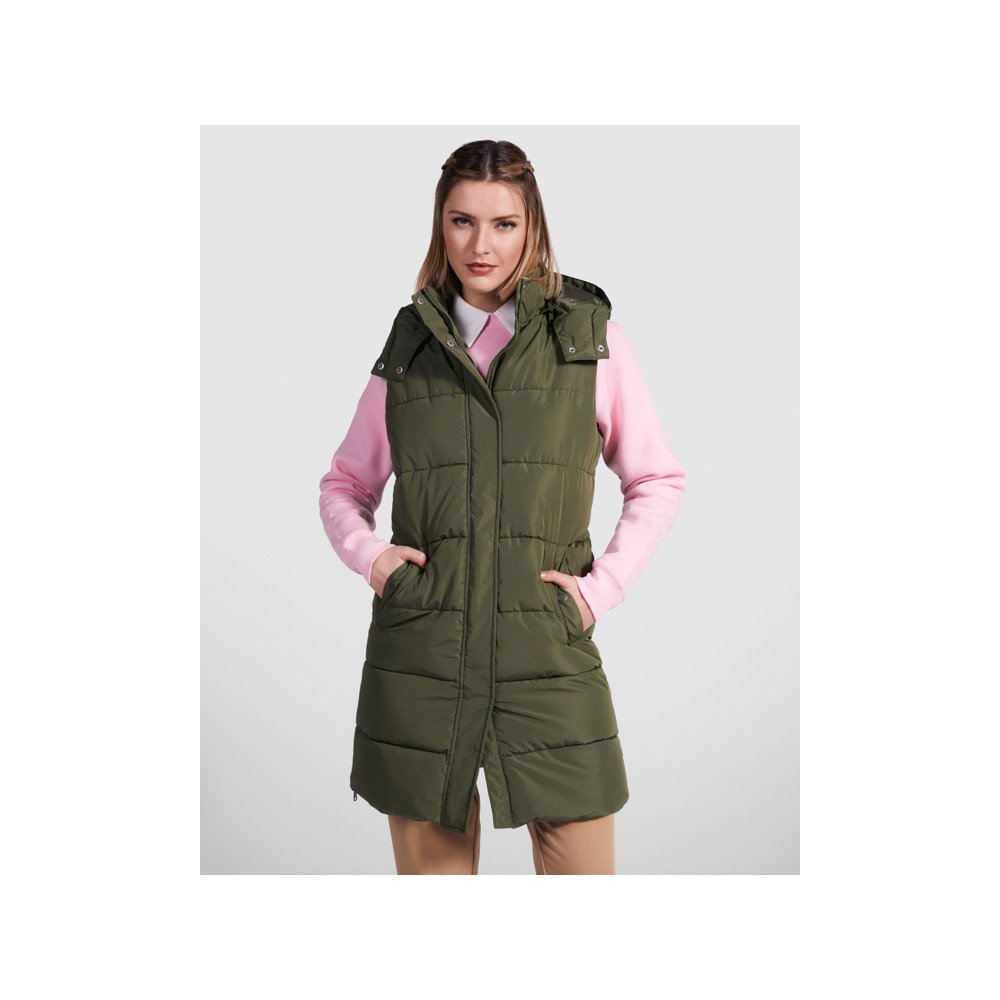 Naiste polsterdatud vest eemaldatava kapuutsiga. Kõrge krae. Klapiga peidetud eesmine tõmblukk.Kaks trukiga suletavat taskut.Tõmblukuga küljeavad.Juurdepääs rinna siseküljele töötlemiseks
