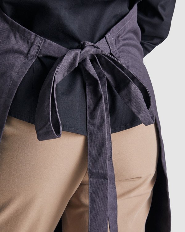 Pikk toimikupõlled ümbertöödeldud polüesterist ja puuvillast.· Reguleeritava kinnitusega kaelarihm.· Külgmised sidumisrihmad.· Kaks taskut.