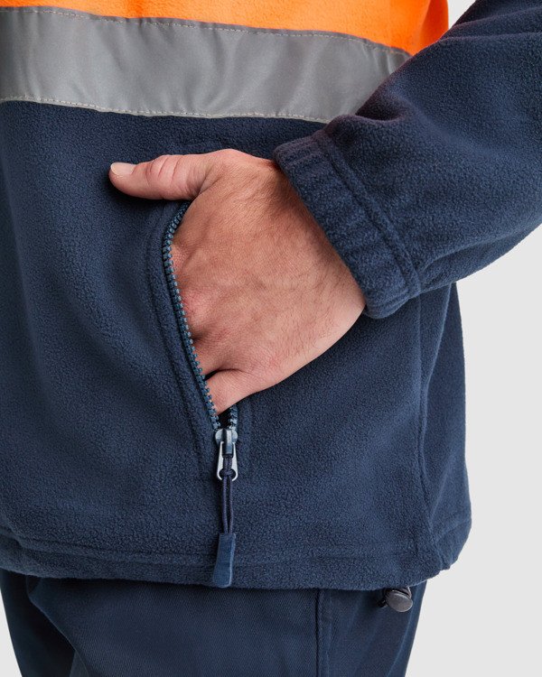 Hea nähtavusega fliisjakk. · Lõuakaitsega eesmine tõmblukk. · Kaks horisontaalset helkurriba rinnal ja varrukatel. · Kaks ühilduva tõmblukuga taskut ja üks tasku rinnal. · Elastsed kätised ja reguleerijad allääres.