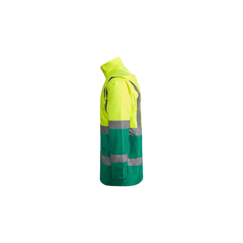 Kombinuota ir paminkštinta didelio matomumo parka. · Vandeniui atsparus audinys su karščiu užsandarintomis siūlėmis.· Atlenkiamas gaubtas su reguliuojamu raišteliu.· Dvi horizontalios gerai matomos juostelės ant krūtinės ir rankovių, ir vertikalios ant pečių.· Krūtinės kišenė su atvarteliu, lipuku ir ID ženkleliu. · Dvi priekinės kišenės.· Vidinė kišenė su užtrauktuku.· Paslėpti 1x1 briaunoti rankogaliai.· Priekinė kišenė su metaliniu užsegimu ir dvigubu užtrauktuku priekyje.Vidinė prieiga ekrano spausdinimui.
