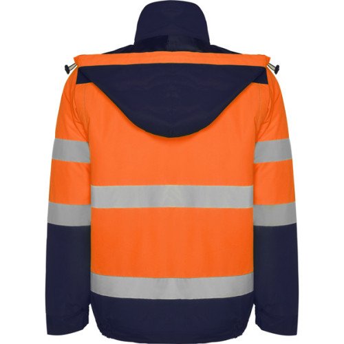 Didelio matomumo parkas, sujungtas į dvi spalvas. Atsparus vandeniui ir vėjui.· Dvi šviesą atspindinčios juostelės ant kūno ir rankovių.· Atlenkiamas gobtuvas su ryškiu stulpeliu ir reguliuojamu raišteliu.· Kišenė ant krūtinės su užtrauktuku.· Dvi šiek tiek pasvirusios ir lengvai pasiekiamos priekinės kišenės.· Elastinis dirželis ant apvado.· Reguliuojami rankogaliai su elastiniais ir lipukais.· Centrinė kišenė su lipukiniu užsegimu ir centriniu fluoro užtrauktuku su traukikliu. Vidinis užtrauktukas su lengva prieiga ekrano spausdinimui.· Nuimamos movos.