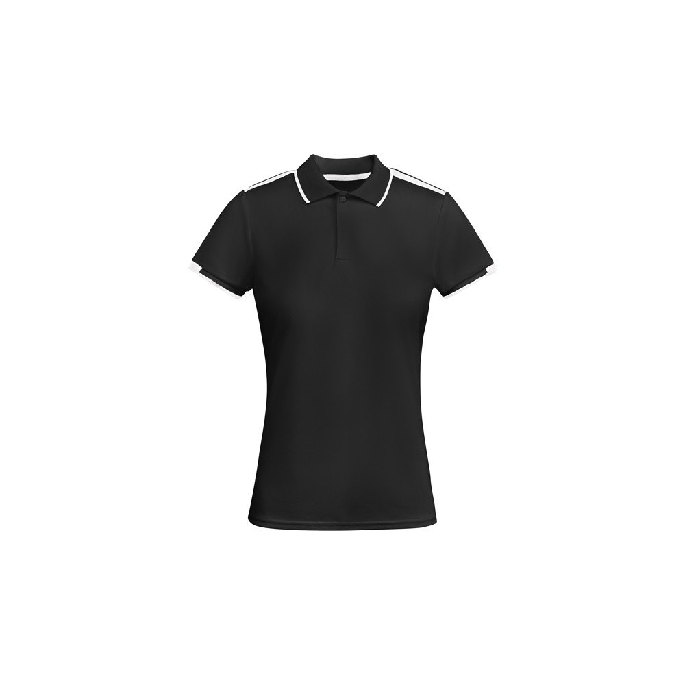 Prigludę sportiniai moteriški polo marškinėliai trumpomis rankovėmis iš antibakterinio perdirbto poliesterio. 1x1 briaunota apykaklė ir detalės rankovių kraštuose. Sustiprintos dengtos apykaklės siūlės. Apykaklė su 2 užsegimo sagomis. Kontrastingos detalės ir pečiai. Šoniniai prakirpimai ant kraštelio.