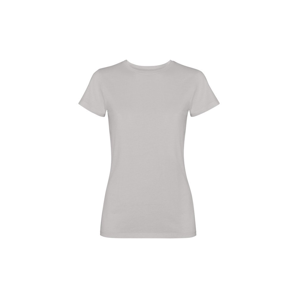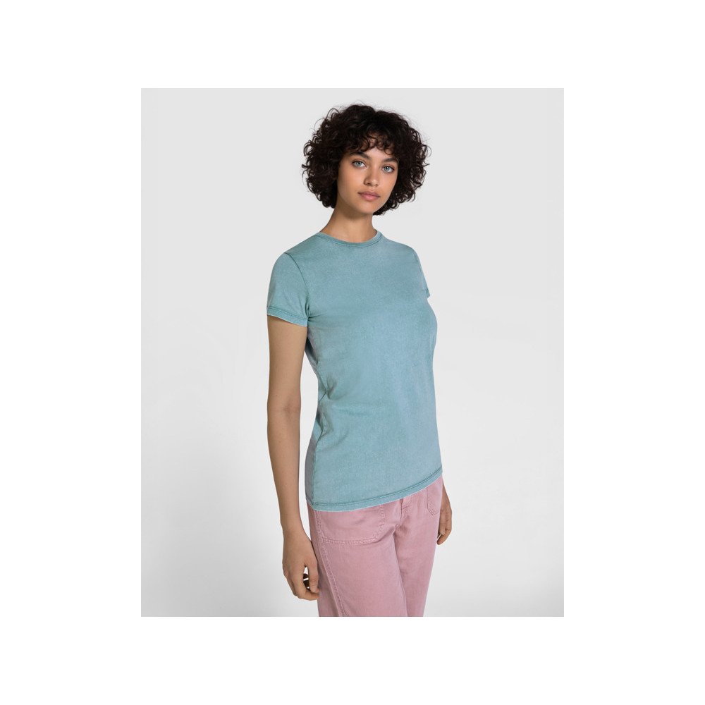 Women's short-sleeve t-shirt, 100% cotton with an acid-wash finish. 1x1 ribbed crew neck and side seams. Tone-on-tone coverstitch at the neck.