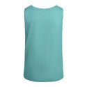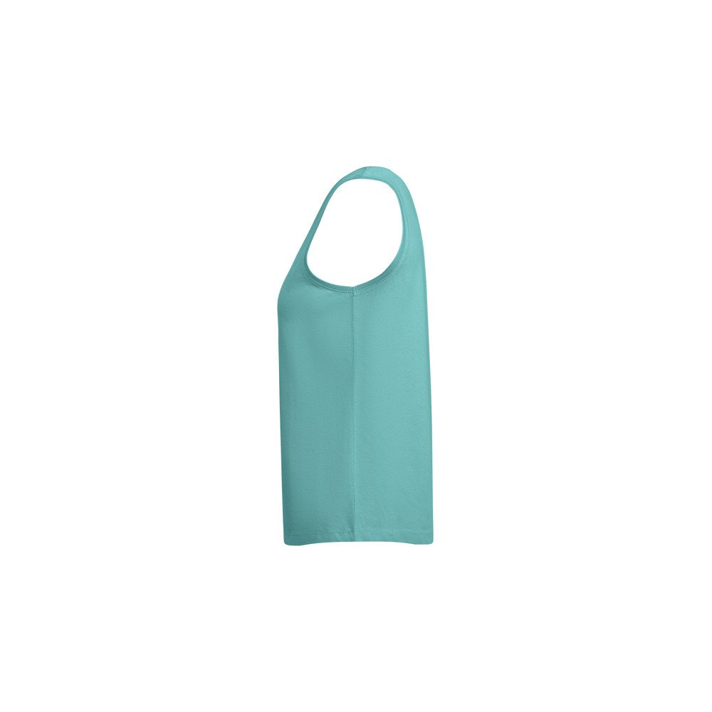 Laisvi marškinėliai moterims su plačiomis petnešomis. 1x1 briaunuota iškirptė ir rankų skylutės. Apvalios formos puspaltis. Šoninės siūlės.