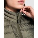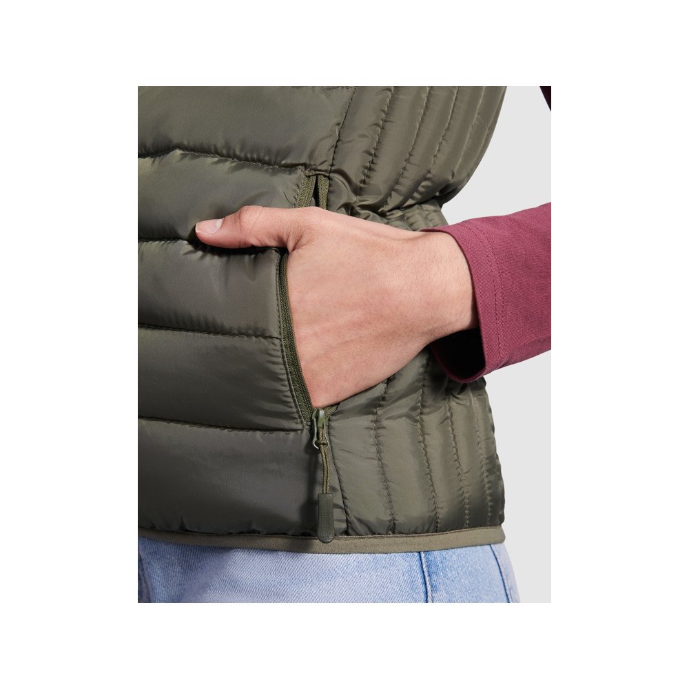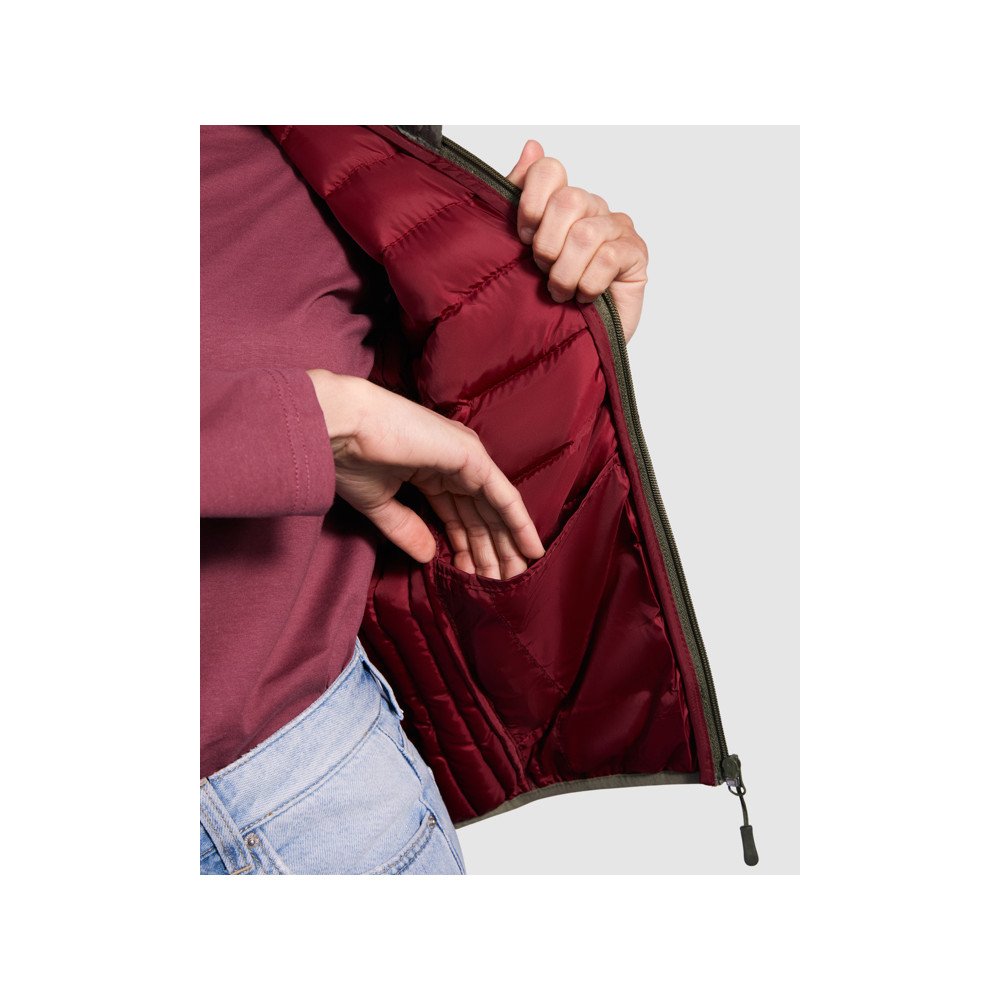 Pritvirtinta giletinė liemenė su plunksnų prisilietimo užpildu.Paslėpti užtrauktukai su derančiomis smakro apsaugomis ir užtrauktukų galvučių liežuvėliais.Dvi šoninės kišenės su užtrauktuku.Kontrastingas vidinis pamušalas.Suderinama elastinė apvado ir porankių apdaila.Lengvas ir sulankstomas drabužis.