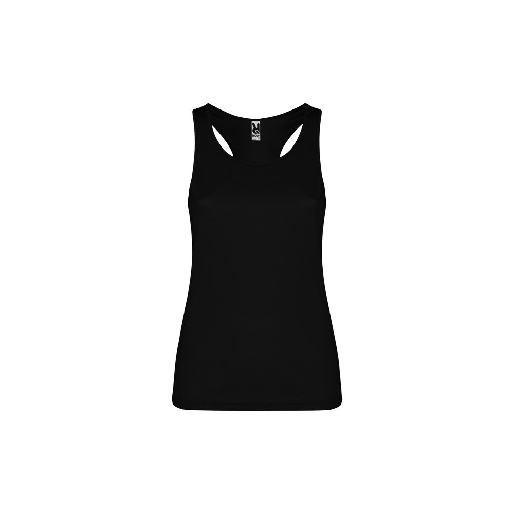 Priglundantys ir orui laidūs sportiniai berankoviai marškinėliai iš lengvai džiūstančio audinio. „Racerback“ dizainas su stulpeliu papuošta kaklo iškirpte ir angomis rankomis.