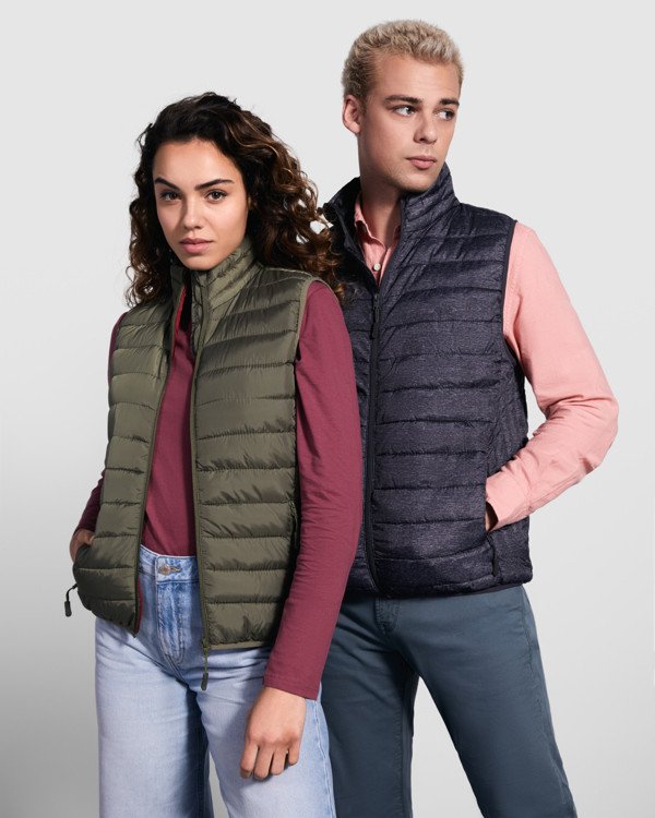 Pritvirtinta giletinė liemenė su plunksnų prisilietimo užpildu.Paslėpti užtrauktukai su derančiomis smakro apsaugomis ir užtrauktukų galvučių liežuvėliais.Dvi šoninės kišenės su užtrauktuku.Kontrastingas vidinis pamušalas.Suderinama elastinė apvado ir porankių apdaila.Lengvas ir sulankstomas drabužis.