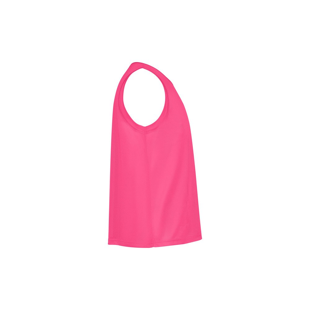 „Unisex“ orui laidūs sportiniai marškinėliai be rankovių. Rankų angos ir apykaklė apsiūta tuo pačiu audiniu. Dvigubas apsiuvimas ant kraštelio.